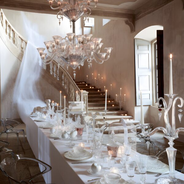 170 yıldır kırılan ışığın efektlerini yücelten simgesel Harcourt yelpazesi, ayaklı kadeh takımının yanı sıra bütün bir ürün ailesini parlak bir kaderle şekillendiriyor.