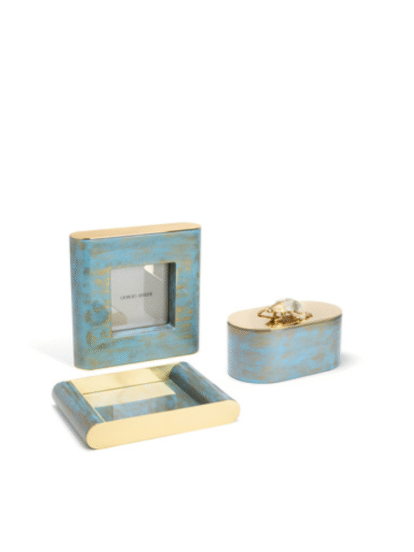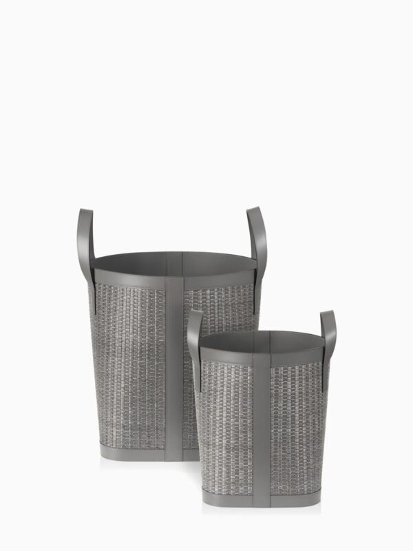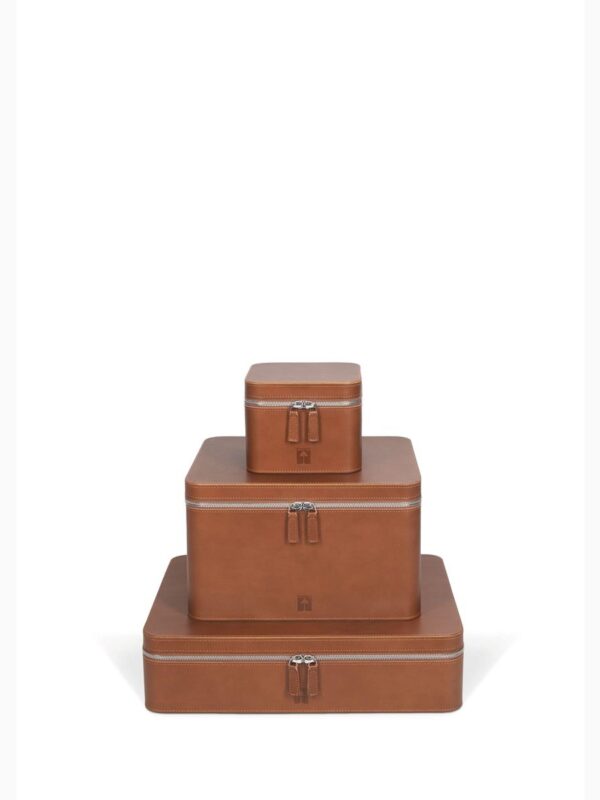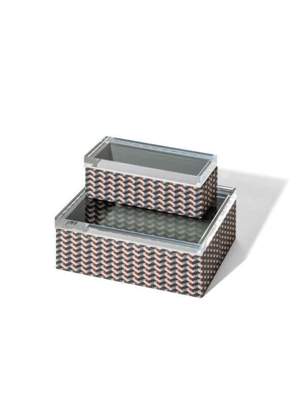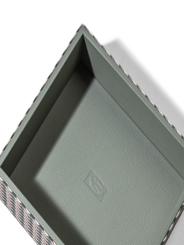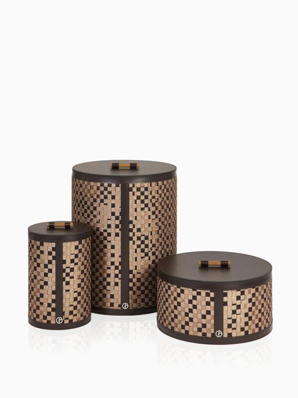 Kapanan fermuarlı ve kabartmalı Armani/Casa logolu, yuvarlatılmış kenarlı kare kutu seti. MDF’deki taban yapısı deri (dış) ve flok kadife (iç) ile kaplanmıştır. Deri detaylı büyük metal fermuar gerçek bir dekoratif unsur haline gelir. Büyük boyut, katlanmış bir ekoseyi kolayca saklayacak şekilde tasarlanmıştır. Nemli bir bezle temizleyin.