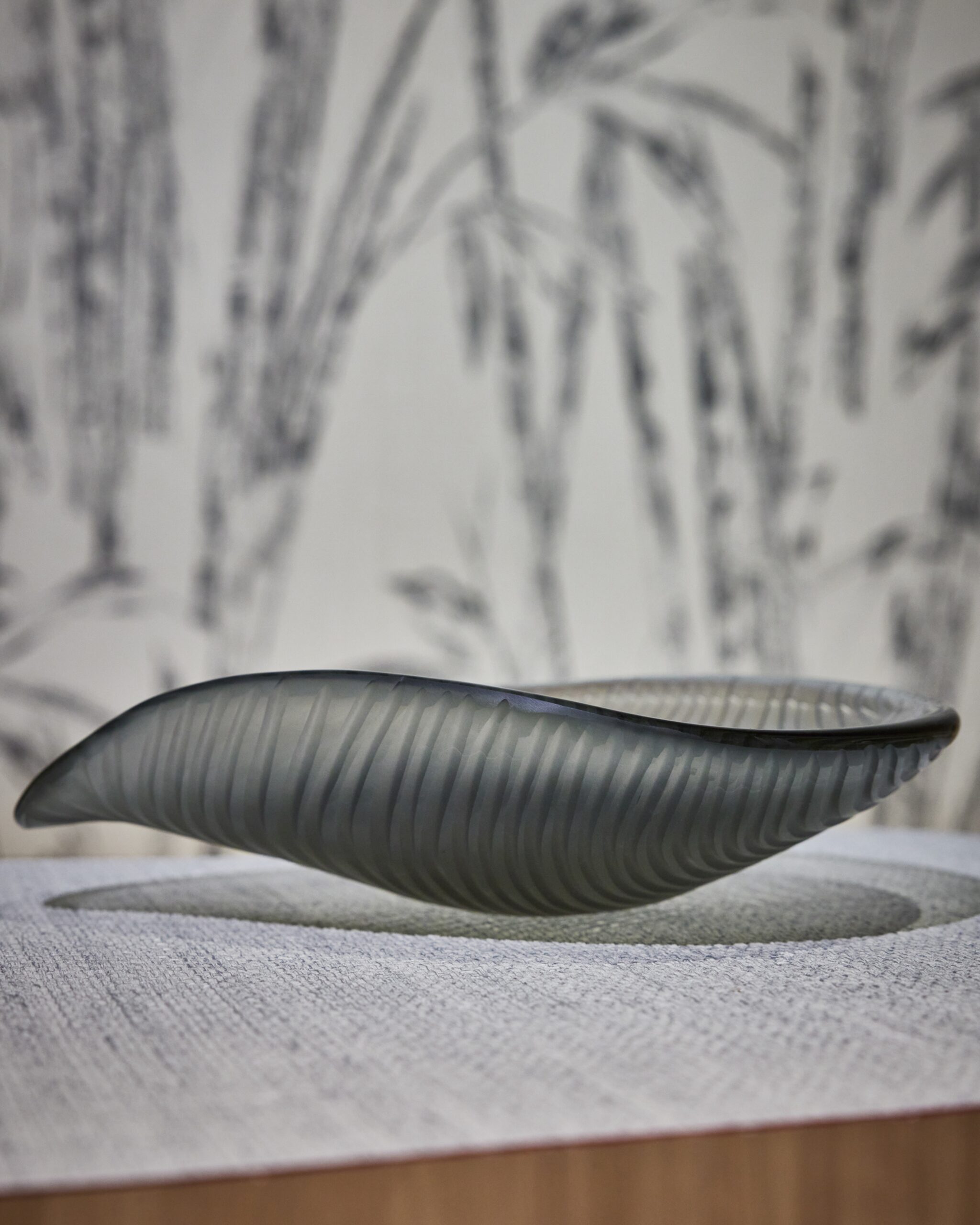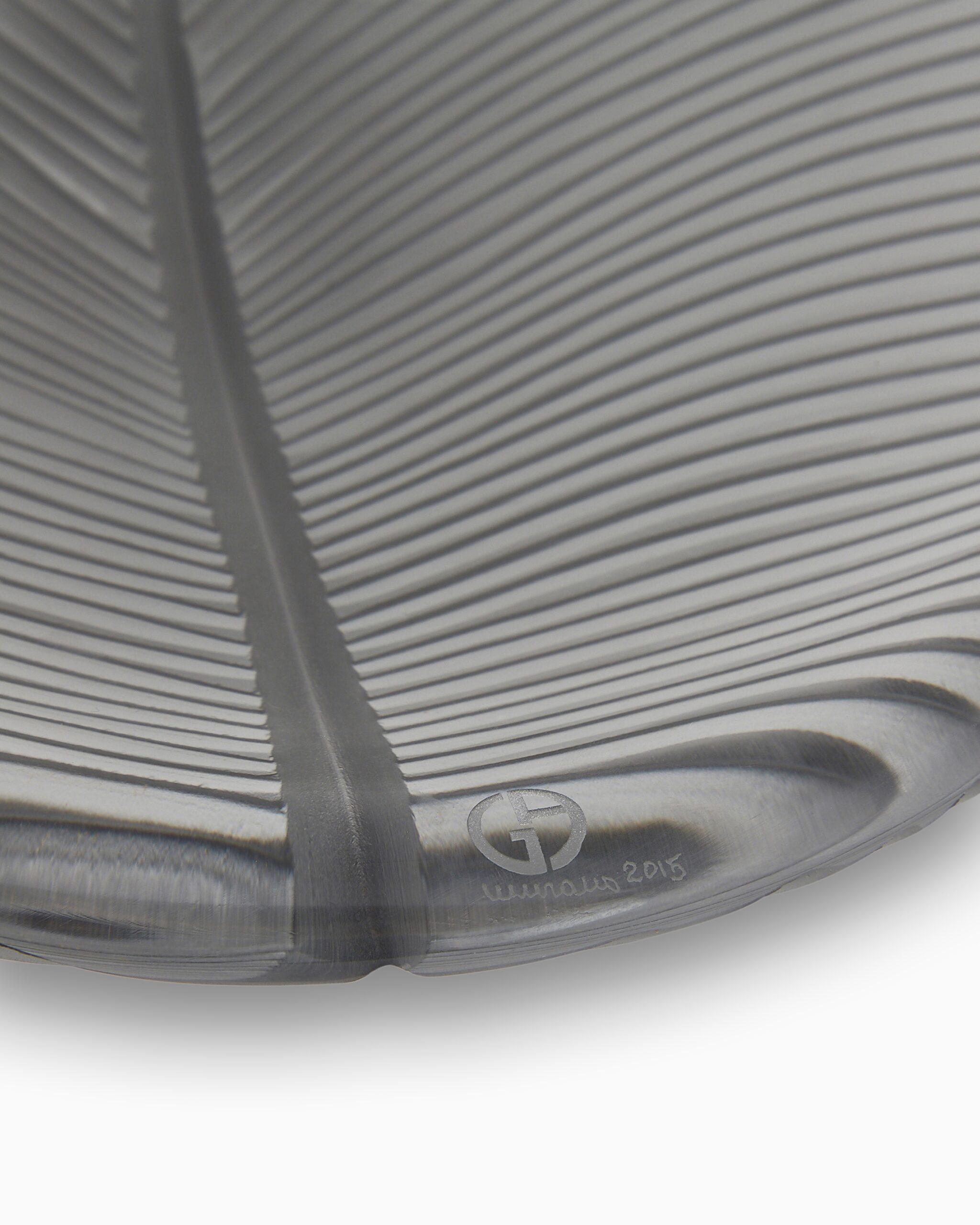 Murano camından yapılmış, tamamen el işçiliğiyle ve hiçbir kalıp kullanılmadan üretilmiş yaprak biçimli bir orta parça. Üretim, bir fırında gerçekleştirilir ve ardından bir yaprağın dokusunu andıran çizgileri oluşturmak için soğuk taşlama işlemiyle tamamlanır. Rengini veren bir pasta içine daldırılmış iki farklı cam katmanından oluşur. Nihai rengin benzersizliği, ana rengi yumuşatan ek bir şeffaf cam tabakasıyla elde edilir. Bu parçaların her biri tek tek üflendiği için, her biri diğerlerinden tamamen farklı ve eşsizdir.