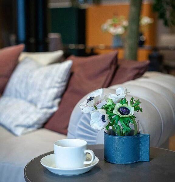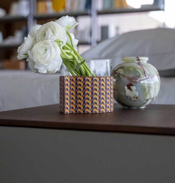 Camın şeffaflığı ve derinin yumuşaklığı, birlikte düzenlenebilen veya ayrı ayrı kullanılabilen bir vazo koleksiyonunda bir araya geliyor.