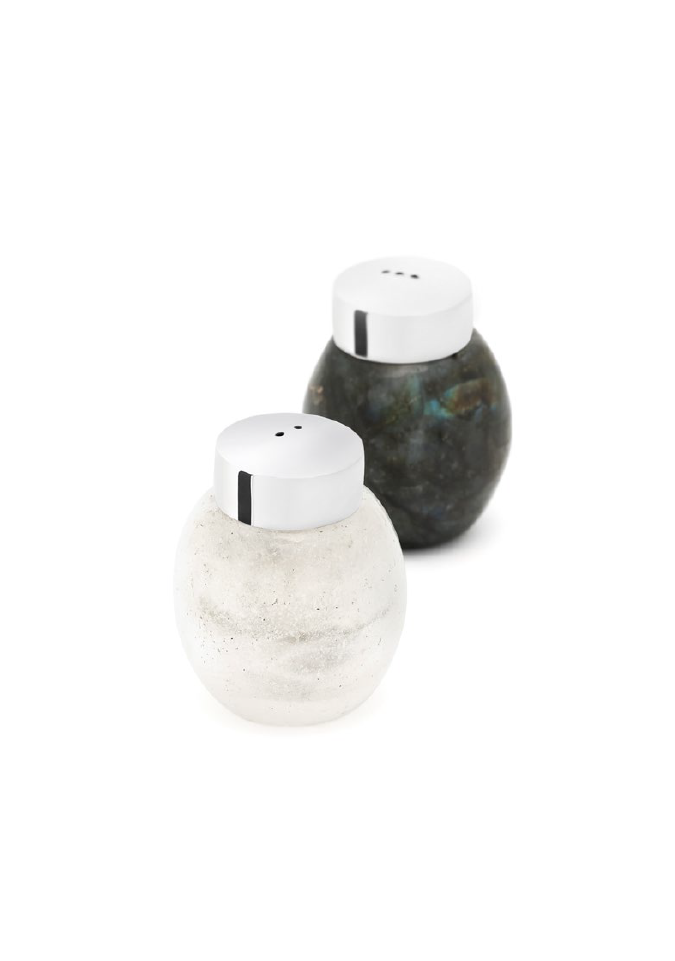 Vaduz koleksiyonunu tamamlayan tuz ve karabiber seti, iki parçadan oluşmaktadır. Her iki ürün de aynı doğal taşlardan — kaya kristali veya labradorit — üretilmiş olup, gümüş kaplama metal detay ile zenginleştirilmiştir. Alt kısmında Armani/Casa logosu yer alır.