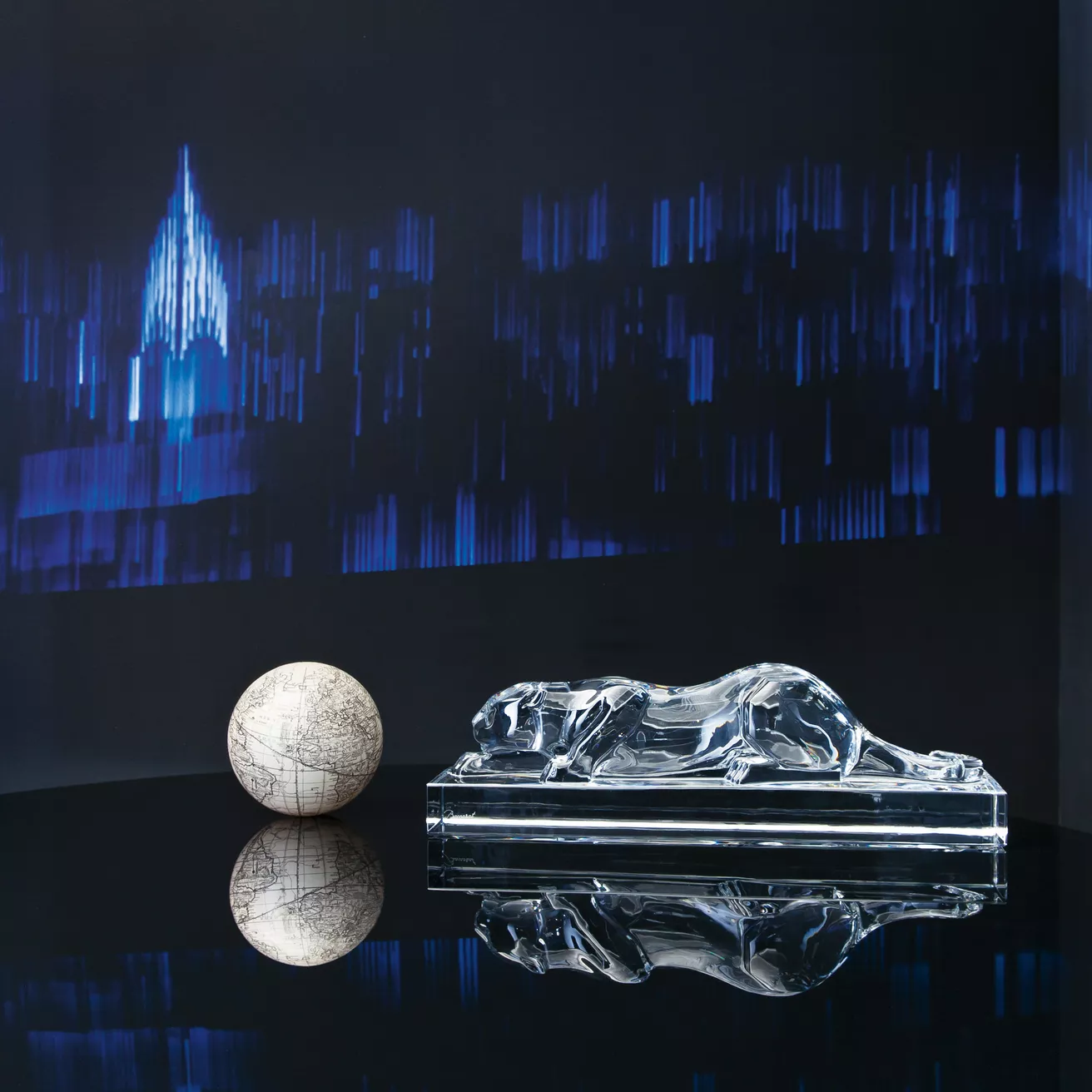 Berrak kristalden yapılmış bu panter heykelciği Georges Chevalier tarafından 1931 yılında yapılmıştır. Figür ve taban tek bir bloktan kesilerek göz alıcı bir dekoratif parça elde edilmiştir. Bu zarif panter heykelciği güç, güç ve otorite yayıyor. Figür ve kaide Baccarat tarafından tek bloktan kesilerek tek parça haline getirilmiştir. Heykelcik, 1931 yılında Georges Chevalier tarafından Baccarat Art Deco koleksiyonuna görkemli bir eklenti olarak yaratıldı. Büyük kedi avına hazır bir şekilde çömelip avının üzerine atlamaya hazırlanıyor. Geleneksel teknikler kullanılarak hazırlanmış gerçek bir sanat eseri olan bu koleksiyon parçasının kedi cazibesine kapılın.