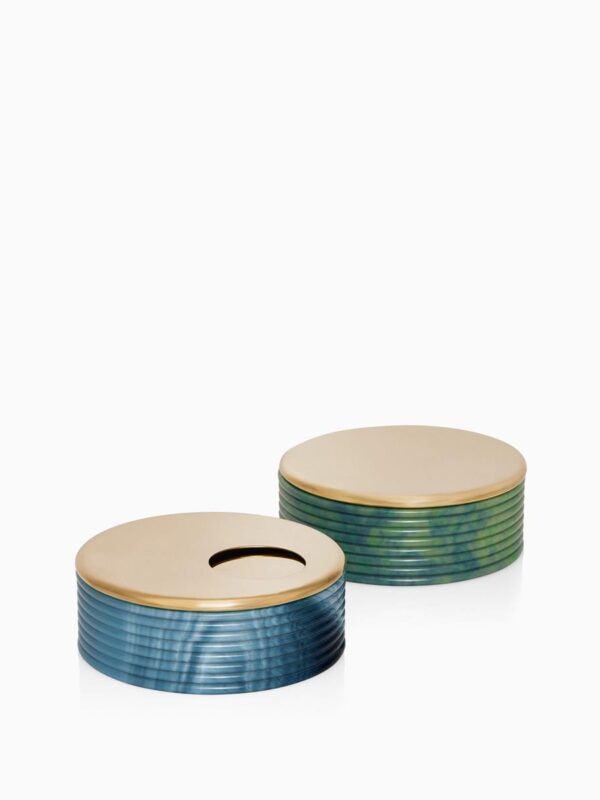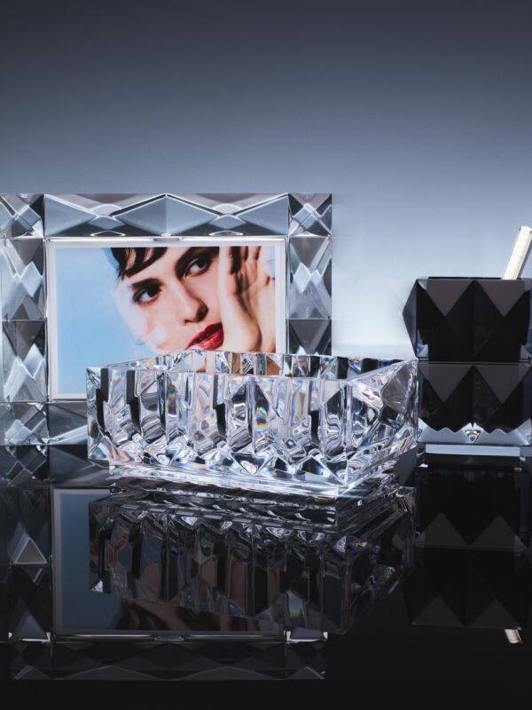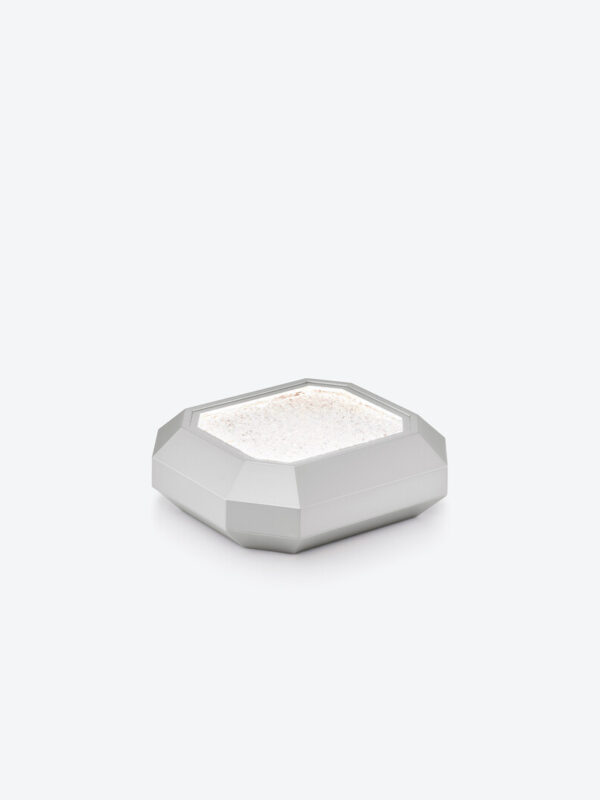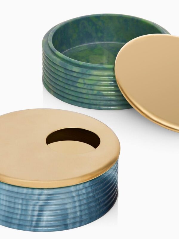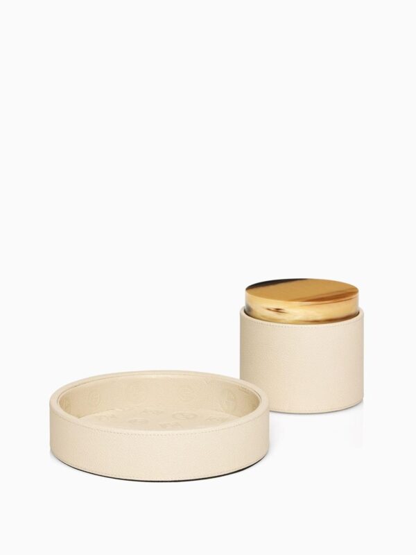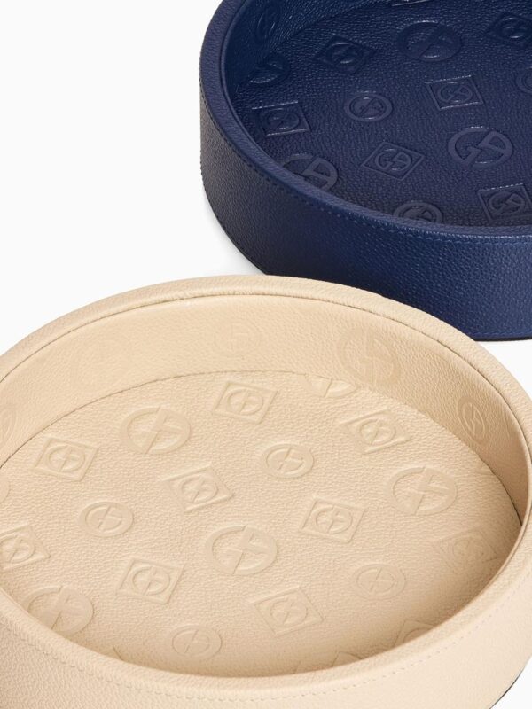 GA logosu metal şeklinden oluşturulan üç bölmeli vale tepsisi. Her bölme, mermer efektli bioresinden yapılmış farklı derinlik ve renge sahiptir. İmza, tabanın altına kazınmış GA logosunu içerir.