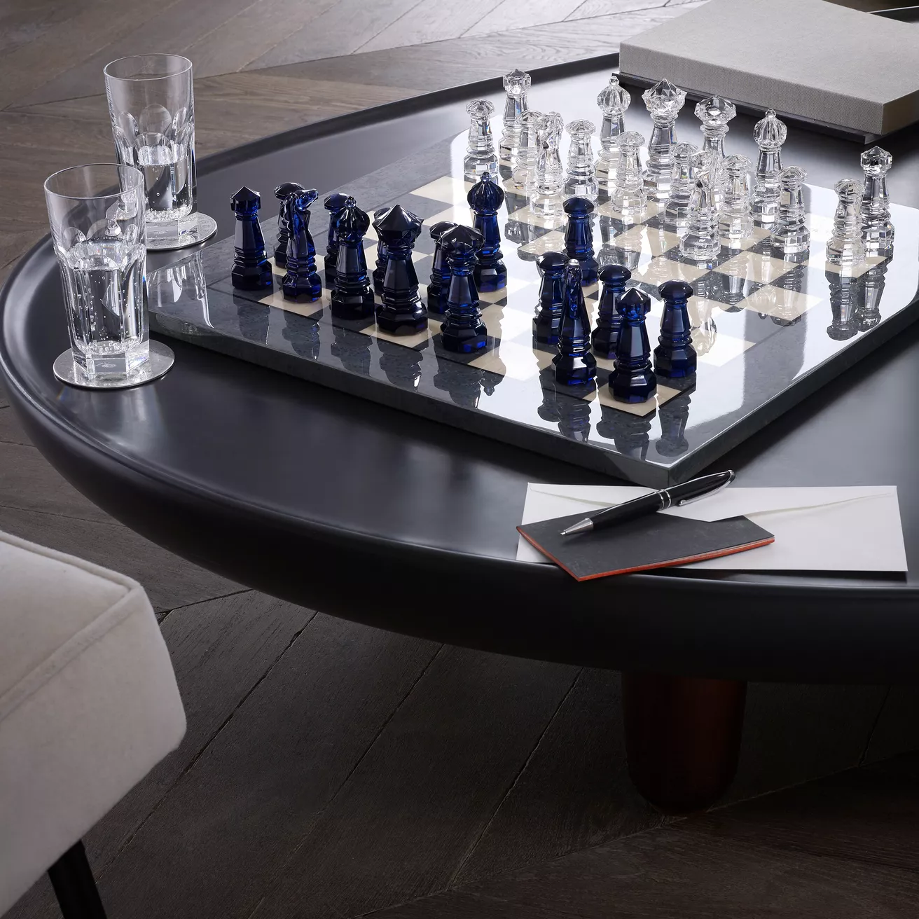 Baccarat bu görkemli satranç setini berrak ve Gece Yarısı kristalinden yarattı. Tüm parçalar Meilleur Ouvrier de France (Fransa’nın en iyi zanaatkarı) tarafından elle kesiliyor. Satranç tahtası nadir ve egzotik ahşaplardan, renklerde yapılmıştır.