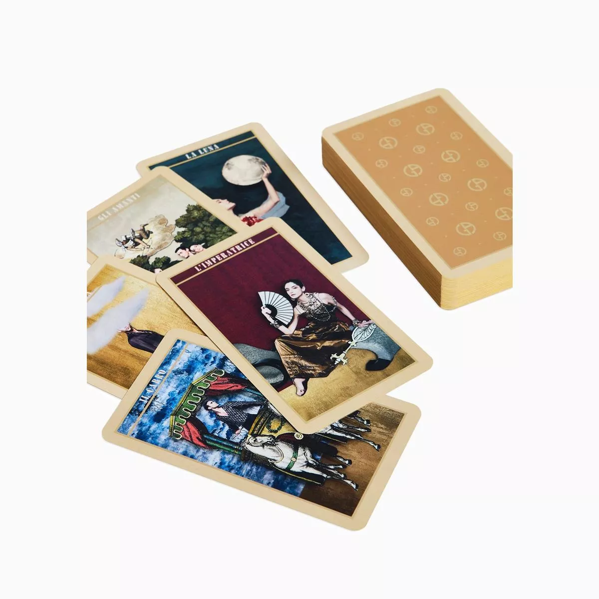Tarot dünyası moda ve tasarım dünyası ile tarot destesi Tale ile buluşuyor. 78 karttan oluşan Tale, klasik kartlardan oluşan standart bir deste olarak da kullanılabiliyor. Hem arşiv hem de Armani moda koleksiyonlarından en yeni kıyafetlerle süslenmiş büyük sırlar, kupalar, sinekler, maçalar ve karolar, ikonik Armani/Casa mobilyaları, kumaşları, duvar kağıtları ve aksesuarlarıyla çevreleniyor. Kartların profili ve GA logosu altın rengindedir. Tale, hareli tasarıma sahip zarif bir kutunun içinde yer alıyor: Giorgio Armani moda kreasyonlarında sıklıkla kullanılan ve Armani/Casa koleksiyonlarında yer alan bir kaplama.