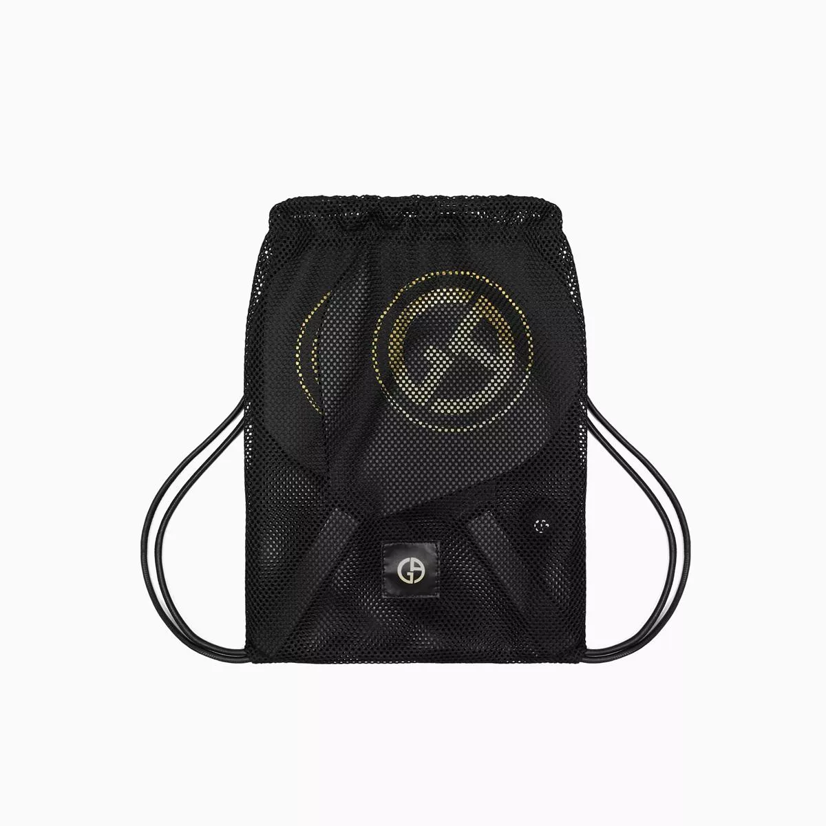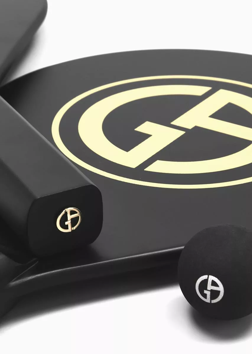Plage serisi, arkadaşlarla tam Armani tarzında spor yapmak için tasarlanmış iki farklı set sunuyor. Plaj tenisi seti, büyük GA logosu gibi altın serigrafi baskı detaylarına sahip ahşaptan iki raket içerir. Siyah bir lastik topun da yer aldığı set, metal GA logosunu taşıyan siyah deri etiketli, file kumaştan yapılmış bir sırt çantasında yer alıyor.