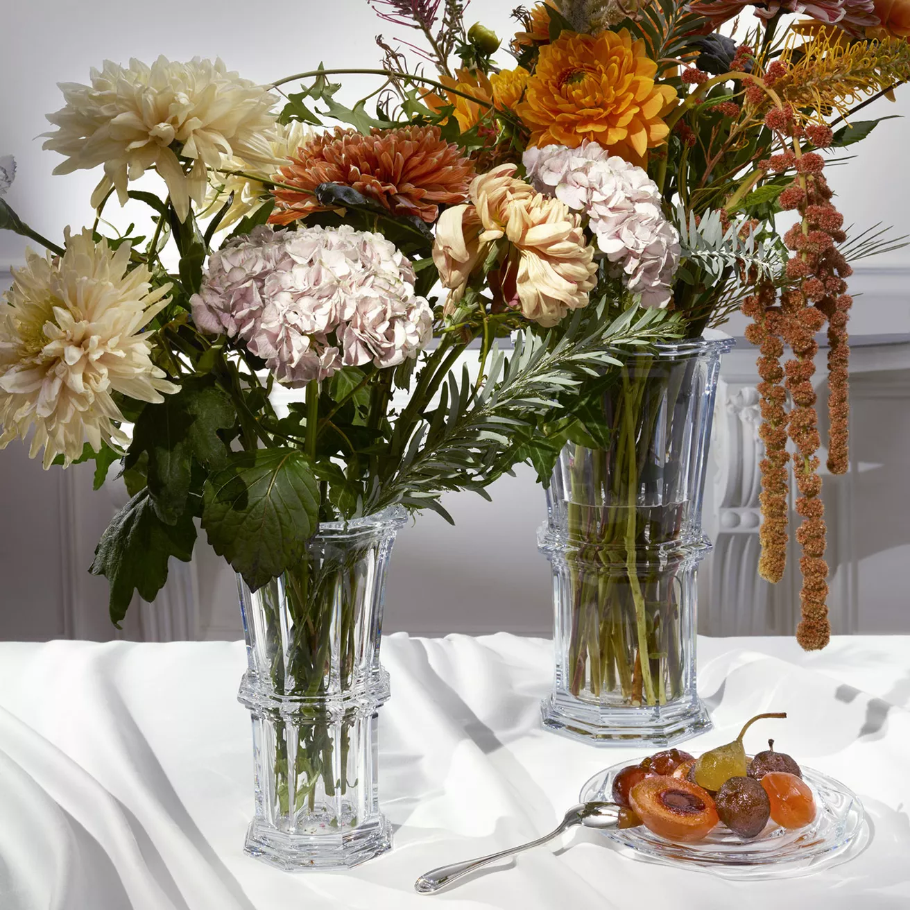 Sekizgen şekli, düz kesim dekoru ve mimari tarzıyla bu vazo serinin en yeni yorumlarından sadece biri.