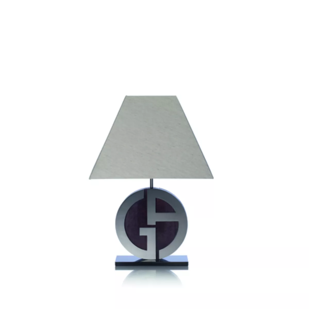 Metalden dikdörtgen tabanlı ve GA logo şekilli saplı masa lambası. Lazerle oyulmuş metal harfler, kertenkele baskılı koyu kahverengi deri kaplı bir öğeyi çevreliyor. Gri veya bronz kumaştan kesik piramit gölgesi.