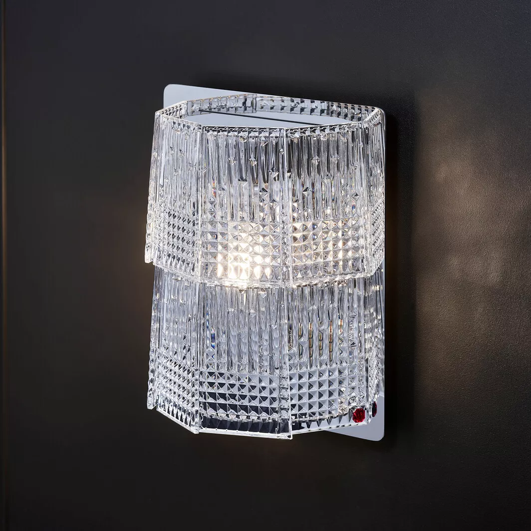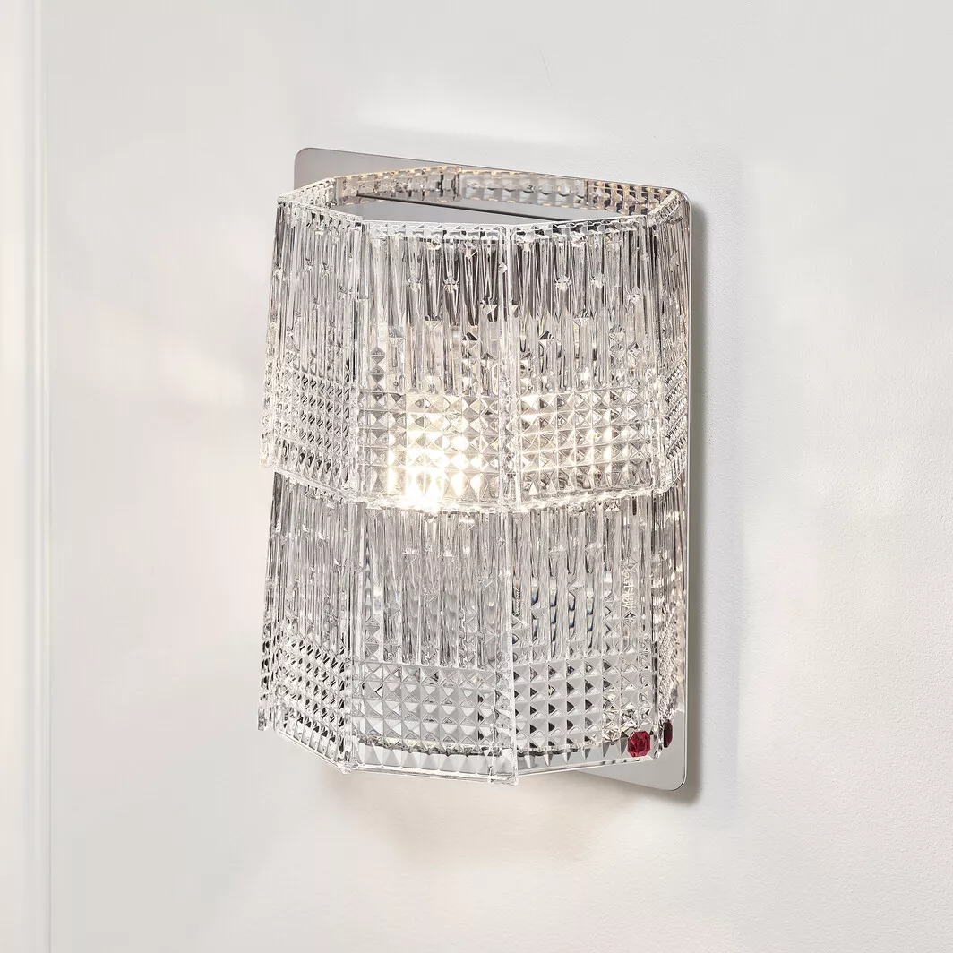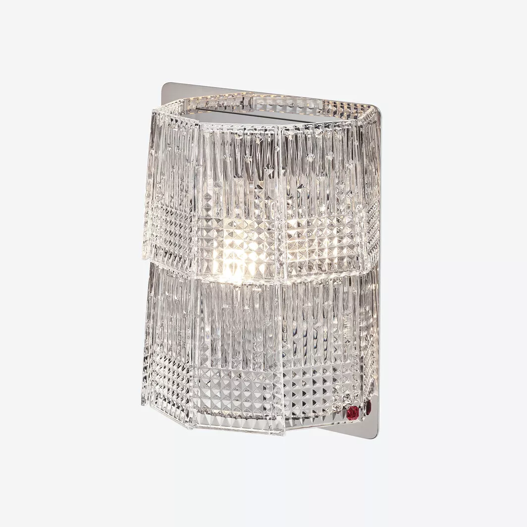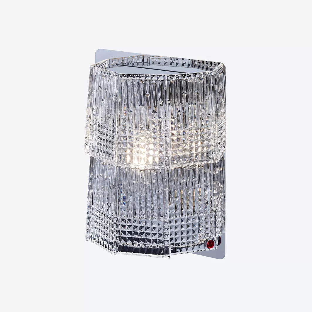 Tuile de Cristal duvar lambası, ayna efektli bir tuval üzerindeki süperpozisyon oyunu sayesinde nefes kesici ve kararlı bir şekilde çağdaş bir etki için malzemeyi göz kamaştırıyor. Arik Levy tarafından tasarlanan Tuile de cristal koleksiyonu, mimari ve tasarım arasında, ışıltılı yaratımlardan oluşan sonsuz bir repertuar oluşturuyor. Modern ve yenilikçi fayanslar tüm arzulara uyum sağlar: Duvar lambası, avizeler ve farklı yükseklikteki tavan lambaları olarak mevcuttur ve tüm iç mekan stilleriyle uyumlu bir şekilde uyum sağlar. Piccadilly ve Frozen olmak üzere iki stilde hayal edilen duvar lambası, Baccarat imzası olan kırmızı bir sekizgen sunuyor.