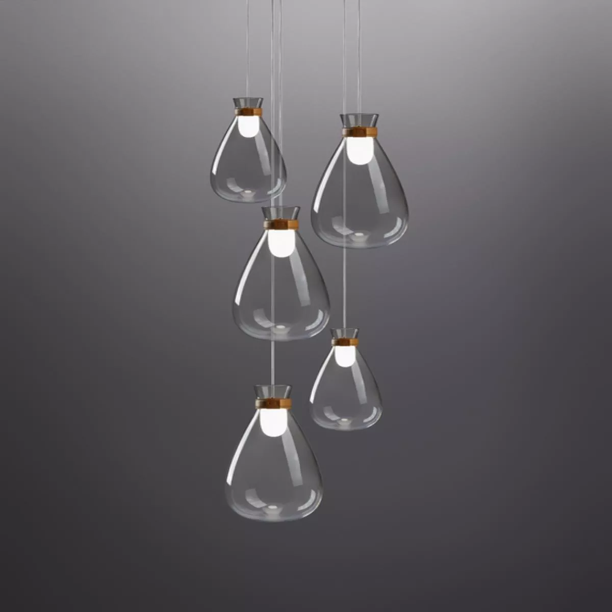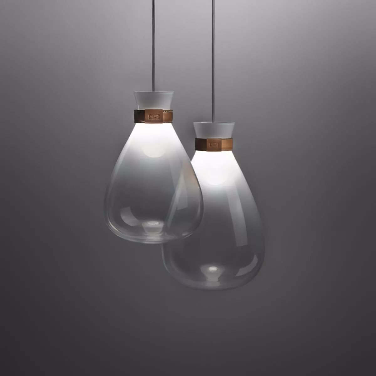 Soffi. Usta Venedikli zanaatkârların üflediği ışığın ve camın saflığı. GamFratesi’nin minimalist tasarımı, üfleme tekniğinin cama şeklini verdiği anı tam olarak yakalıyor. Yerçekimiyle uzayda asılı duran ince bir eyer-deri kayıştan narin ve düzensiz küreler çıkıyor gibi görünüyor.