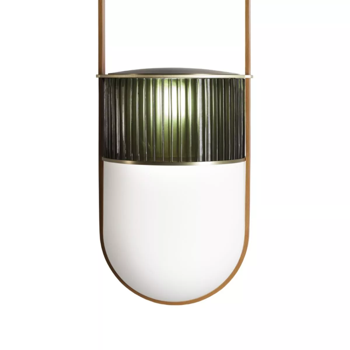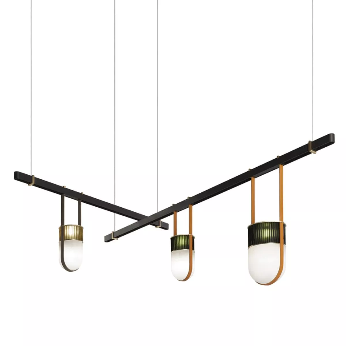 Aydınlatma aksamı, Camel ve Taupe olmak üzere iki farklı renkte, boyalı tonlarda işlenmemiş kenar dikişli ve markalı Poltrona Frau logolu Cuoio Saddle Extra deri kayışa asılıyor. Yeni zemin ve sarkıt versiyonlarında, lambayı asmak için kullanılan askı, fırçalanmış pirinç kaplamalı metal bir halka ile yerinde tutulur. Xi koleksiyonu çeşitli lamba türlerinden oluşur: sarkıt lambalar, yatay çubuklara takılan ve sabit olmayan lambalar, yer kollu lambalar ve masa lambaları. Tekli veya çoklu lambalardan oluşan çeşitli kombinasyonlarda mevcut olan sarkıt versiyonunda, Xi ışıkları, 130 cm ve 180 cm olmak üzere iki uzunlukta ve mat tunç grisi kaplamalı, yüksekliği ayarlanabilir yatay bir çubuğa takılır. Elektrik kabloları siyah kaplamalıdır. Çubuğun raylı yapısı, ışıkların yatay olarak hareket ettirilmesine ve istenilen pozisyonda sabitlenmesine olanak sağlar. Masa lambası versiyonunda aydınlatma armatürü, doğal pirinç kaplamalı metal bir taban üzerine yerleştirilmiş büyük bir fenerden oluşur. Cuoio Saddle Extra deri kayış lambayı destekler ve hareket ettirirken tutacak olarak kullanılabilir. Işık, açma/kapama dimmer dokunmatik sistemi kullanılarak ayarlanabilir. Yer kolu lambası tek bir ekstra büyük sarkıt lambadan oluşur. Destek çubuğu fırçalanmış perdahlı çelikten yapılmıştır. Aydınlatma armatürünün takıldığı Cuoio Saddle Extra deri kayış tabana kadar devam ederek çelik montajın alt kısmını kaplıyor. Alt kısım, üzerinde metal bir denge bulunan yarı cilalı Nero Marquina mermerinden yapılmış dairesel bir tabandan oluşur. Mermer taban sac kaplamaya sahiptir. Tabanın tüm metal detayları fırçalanmış perdahlı bir yüzeye sahiptir. Ekstra Büyük Sarkıt versiyonu, Cuoio Saddle Ekstra deri kayış kullanılarak asılan tek bir ekstra büyük fenerden oluşur. Tavana tutturmak için kullanılan gül, fırçalanmış pirinç kaplamalı alüminyumdan yapılmıştır.