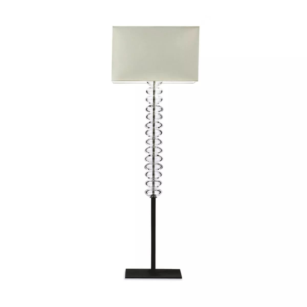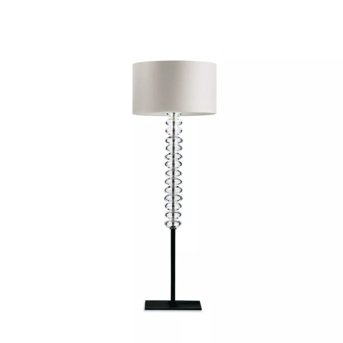 Fede zemin lambası, üzerine şeffaf cam baloncuklardan oluşan değerli bir kolyenin uygulandığı boyalı metal bir çerçeveye sahiptir.