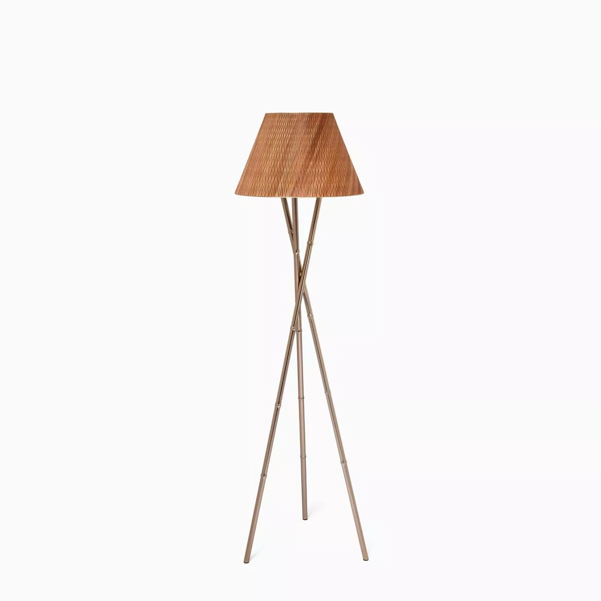 Tripod yapılı yer lambası. Bacaklar, metalde üç bambu kamışını yeniden üretecek şekilde tasarlanmıştır, dolayısıyla bu lambayı Pamela serisiyle uyumlu hale getirir. Kumaştan veya özel mikro delikli karaağaçtan, kesik koni şeklinde gölgelik. İkincisinin karmaşık tasarımı hasır desenlerden ilham alıyor ve ışığın geometrik yansımalarıyla özel bir şeffaflık etkisi yaratıyor. Bu gölgenin ahşabı bir iç PVC katmanıyla birleştirilmiştir ve kenarlarda dekoratif metal halkaların yanı sıra iki difüzör diski (ışık kaynağının üstünde ve altında) içerir; kumaş gölge bunun yerine yalnızca bir üst difüzör diskine sahiptir.