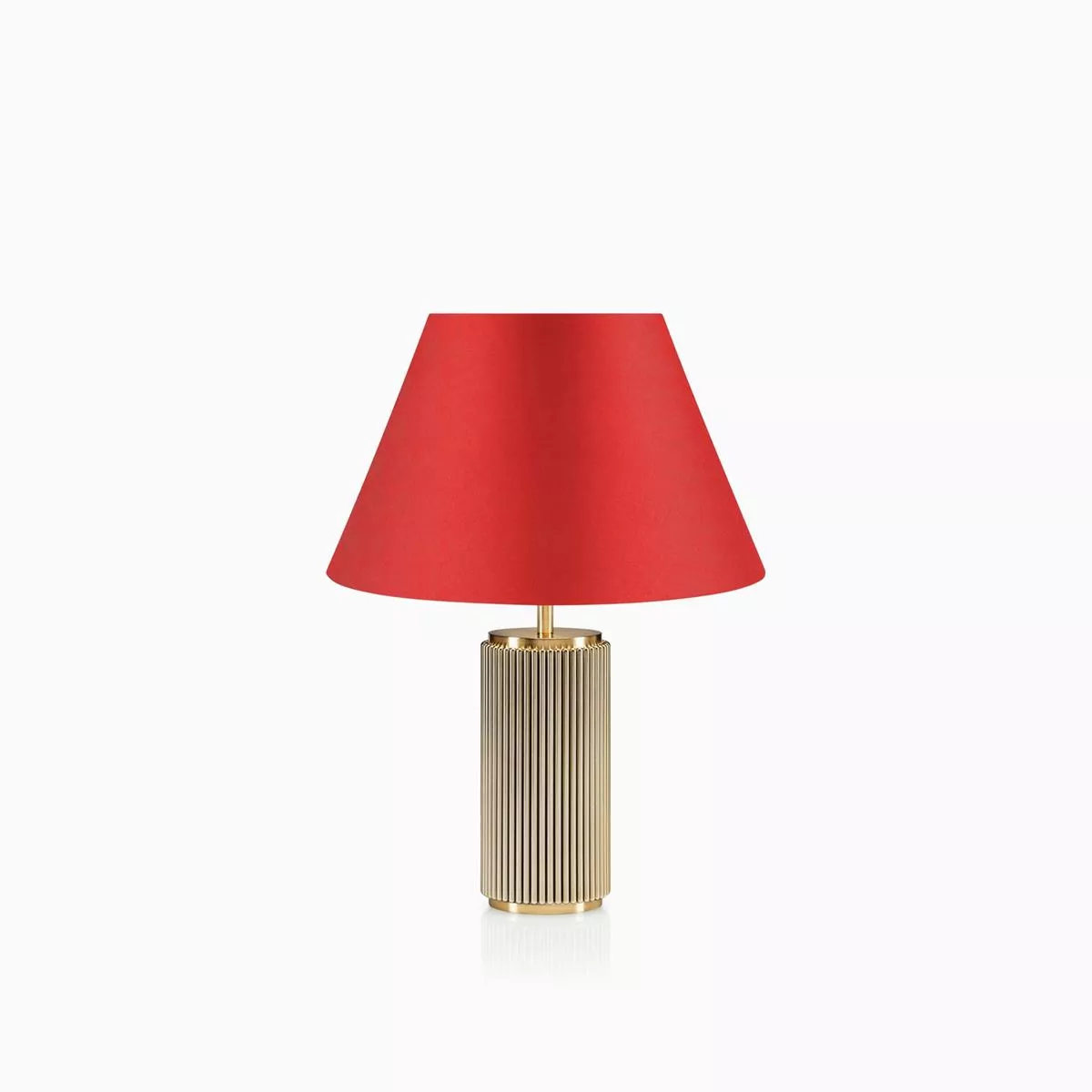 Paladino, dikey olarak geliştirilen üç boyutlu canneté fikrinden doğan bir masa lambasıdır: bu nedenle bu ürün için seçilen kaplama, halihazırda bir Armani/Casa simgesi olan Pirinç Oymalı Sıvı Metal’dir. Sıvı metal, kaplamaya gerçek metalin tipik yansımasını ve soğuk dokunuşunu veren, gerçek metal pigmentlerinden yapılmış özel bir ciladır. Desteğe bağlı olarak farklı efektler elde etmek mümkündür: Burada gösterilen oymalı versiyon, eski pirinç çubukların yanılsamasını yaratıyor. Üst difüzör diski ile kumaştan (beyaz, kırmızı veya yeşil) kesik koni gölgesi mevcuttur.