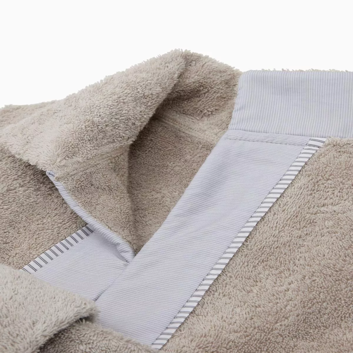 Teodora, gömlek kumaşı eklemleriyle karakterize edilmiş pamuktan yapılmış şık bir banyo takımıdır. Üç farklı bedende mevcut olan bornozu, mandarin yaka ile dikkat çekmektedir.