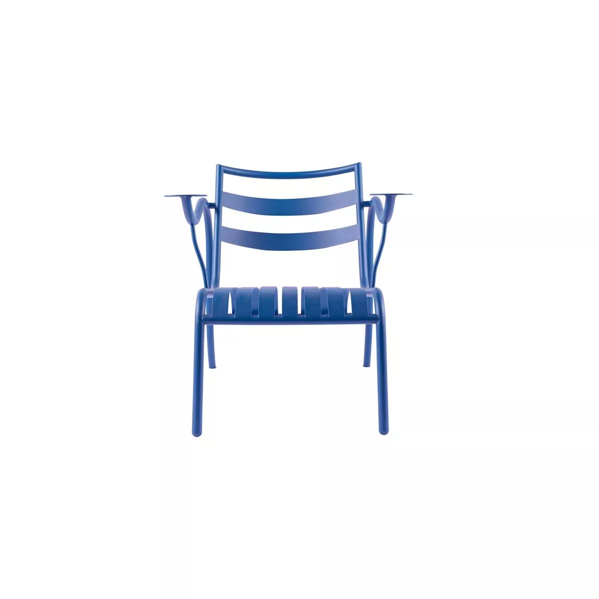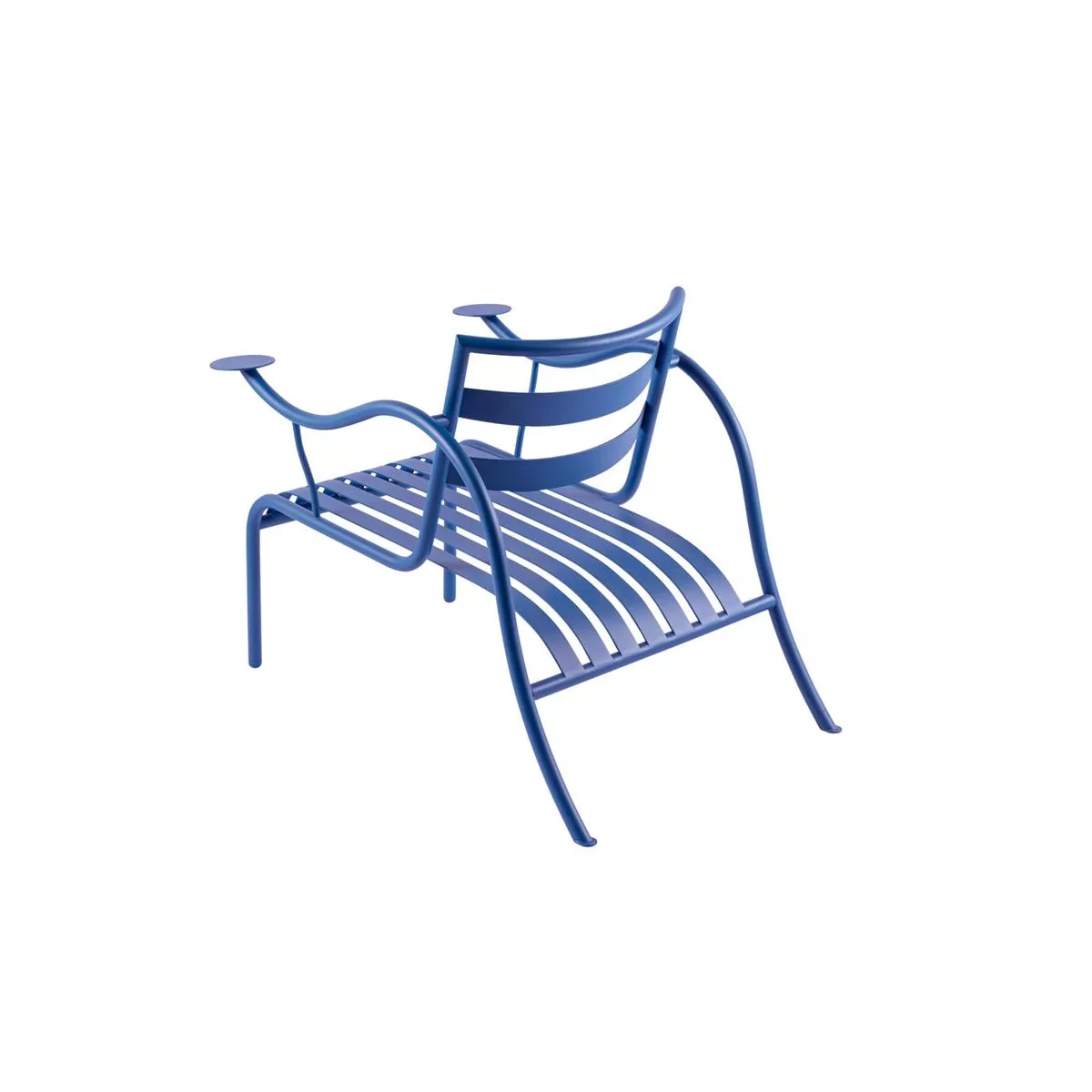 Kolçakları küçük bardak tutucu tepsilerle donatılmış, yalnızca yapısal metal elemanlardan oluşan dinlenme koltuğu.
