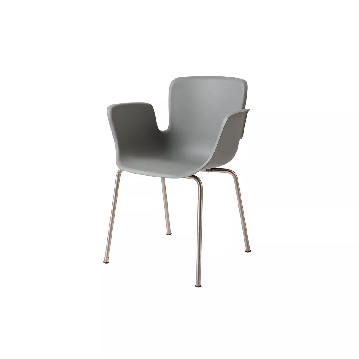 Geri dönüştürülmüş ve geri dönüştürülebilir cam elyaflı polipropilenden yapılmış, paslanmaz çelik tabanlı ve gövdeli, kolçaklı küçük koltuk.