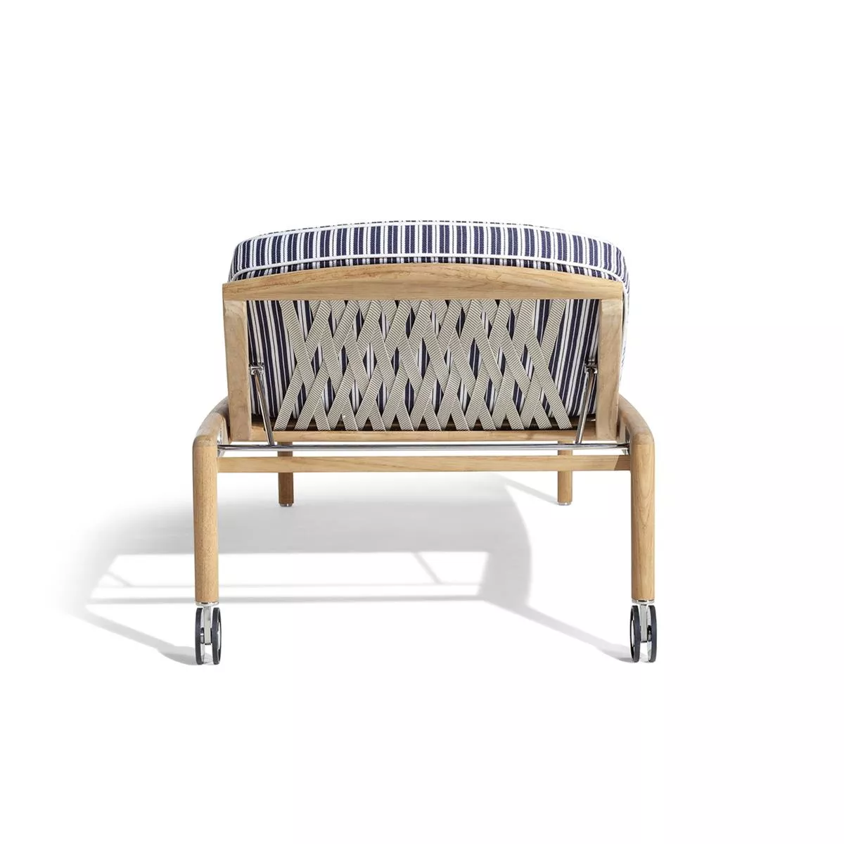 Bir bahçenin, verandanın, özel terasın veya spa ve sağlıklı yaşam merkezlerinin açık hava alanlarının yanı sıra havuz kenarında veya yat güvertesindeki dinlenme alanını Made in Italy tasarımı işçiliği ve tipik tasarım işçiliği ile donatmak için zarif bir şezlong. Akdeniz kültürünün tarzı. Şezlong, doğal yüzeyli masif tik ağacından yapılmıştır ve birbirine yakınlaşan geometrik hatlar ve minderi destekleyen iç içe geçmiş iki tonlu ekru ve boz kahverengi dokuma ile üç pozisyonda yatırılabilen sırt dayanağı ile karakterize edilir. Dolgu, suyun hızla akıp kurumasını sağlayacak şekilde tasarlanmıştır. Dış mekan şezlongu, arkadaki tek yönlü tekerlekler sayesinde kolayca hareket ettirilebilir. Poltrona Frau Sınırsız Yaşam Dış Mekan Koleksiyonlarını tamamlayan, Roberto Lazzeroni tarafından tasarlanan dış mekan mobilya koleksiyonu The Secret Garden’ın bir parçası.