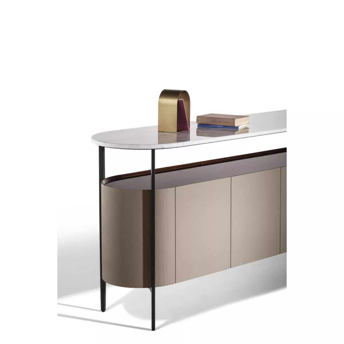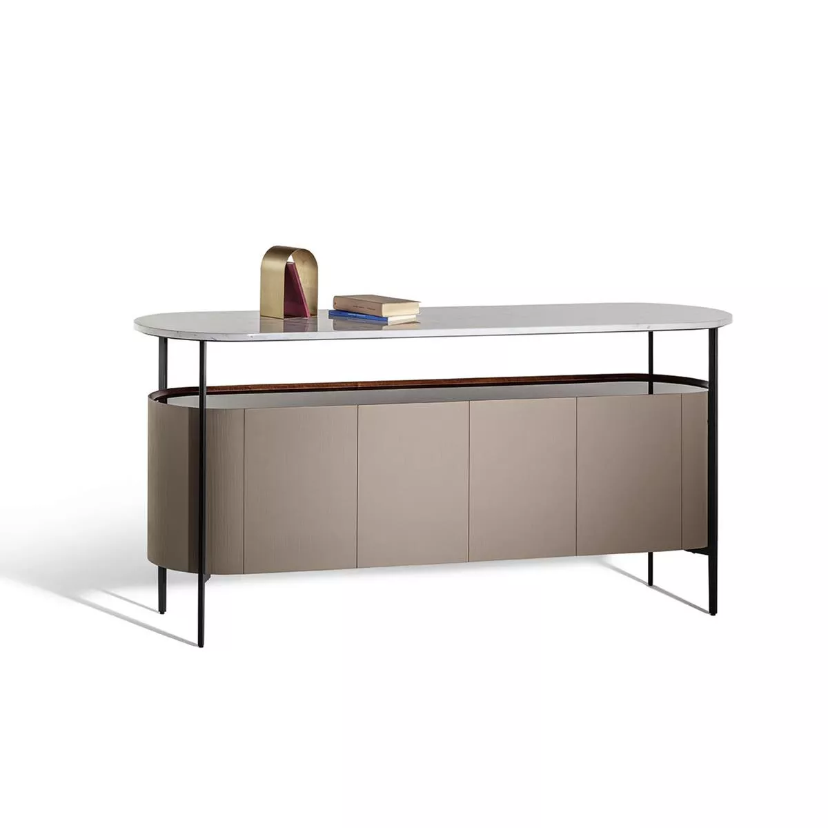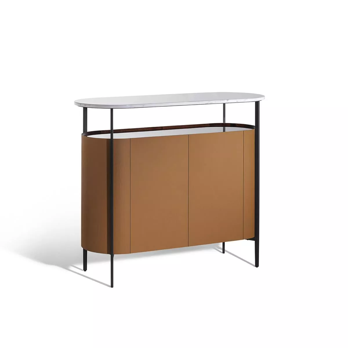 Mi depolama ünitelerinin dış yüzeyi, ürüne 3D efekti veren orijinal dikey çizgili kannet dokusuyla süslenmiş Saddle Extra deri ile kaplanmıştır. İnce ama sağlam metal yapı, ürünün gövdesini çerçevelemektedir ve Calacatta Gold veya Nero Marquinia mermerinden yapılmış yükseltilmiş üst kısım ile bir bağlantı görevi görür.