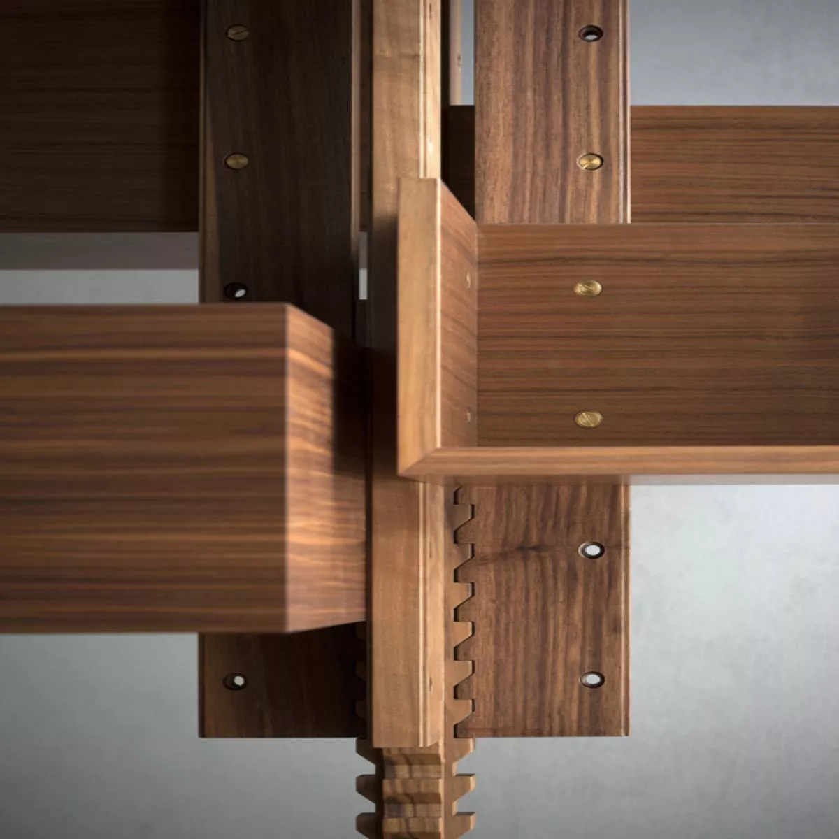 Yapı, hem karmaşık dolap işçiliği hem de odanın en önemli parçası olmasını sağlayan heykel görünümüyle dikkat çekiyor. Albero kitaplığının destekleyici yapısı masif Canaletto cevizinden yapılmıştır. Özel bir raf bağlantısına sahip iki dişli destekten ve 8 veya 12 rafın monte edilmesini mümkün kılan düzenli delikli dört dikey sütundan oluşur. İkincisi ahşap kaplamalı MDF’dir. Tavandaki ve zemindeki kapaklar dişli desteklerin uçlarına tutturulmuştur. Üst kapak tavana sabitlenmiş bir “fincan” içine yerleştirilmiştir. Alt kapak kaymaz bir lastikle zemini kavrar. Kitaplık, kapaklardaki dört metal kilit somunu ile güvenli bir şekilde yerinde tutulur. Sabitleme elemanları (kapak ve bardak) antika perdahlı çelik kaplamaya sahiptir. Tasarımcının imzası ve Poltrona Frau logosu alt dişli desteğin üzerine lazerle kazınmıştır. Albero kitaplık 360° dönebilir. Talep üzerine raf yüzeyleri 4 mm kalınlığında, kenarları aynı tonda boyalı Cuoio Saddle deri parça ile süslenebilir ve korunabilir. Ek parçanın kenarlarında el işaretleri vardır ve Poltrona Frau logosuyla markalanmıştır.