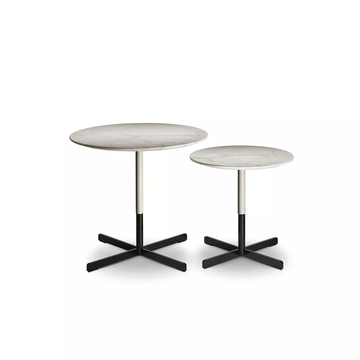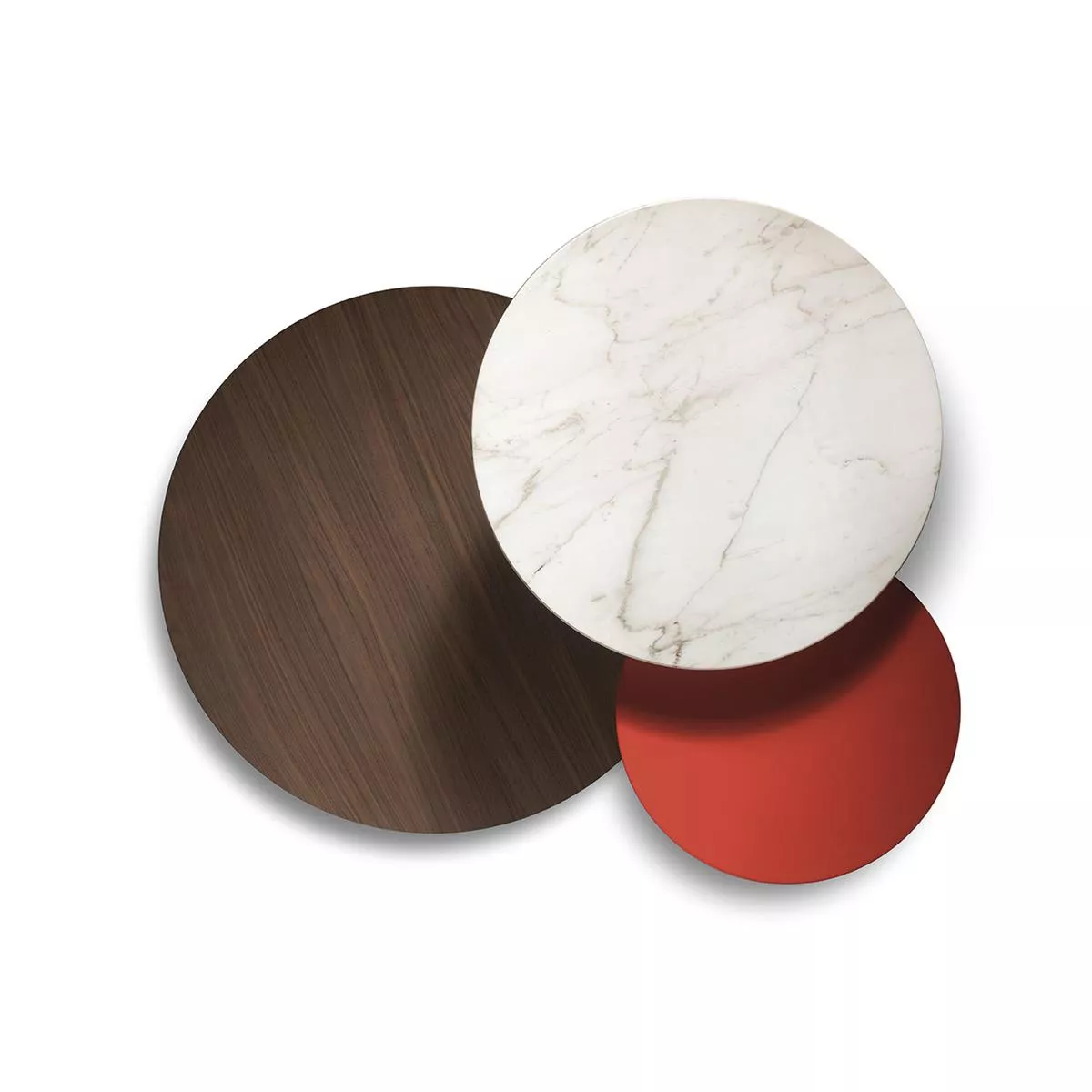 Bob yan sehpalar, metal grisi, rutenyum, fırçalanmış perdahlı ve Canaletto ceviz kaplamalı (ikincisi yalnızca deri veya mermer üstlü versiyonlarda mevcuttur) çelik bir tabana sahiptir. Üst kısım Pelle Frau® deri, Canaletto ceviz kaplamalı huş kontrplak, Emperador mermeri veya Calacatta altın mermeri (cilalı veya yarı cilalı) olarak mevcuttur (ø 110 modeli hariç). Bacağın üst kısmı her zaman masa tablasının bitişiyle eşleşir. Mermer tablalı versiyonlarda bacağın üst kısmı uyumlu renkte deri döşemelidir.