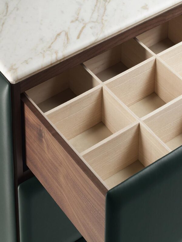 Obi depolama sistemi, süt renginde çizilmeye dayanıklı boya ile lake veya Bruno ceviz kaplamalı ahşap olarak mevcuttur. Obi şifonyer, komodin ve şifonyer metal kılavuzlara monte edilmiş, yavaş kapanan çekmecelere sahiptir. Çekmece ön yüzeyleri ve kulplar tamamen aynı veya farklı renkte, aynı tonda veya kontrast dikey dikişli, zarif bir dekoratif efektli Pelle Frau® deri ile kaplanmıştır. Her Obi kabının üst kısmı istek üzerine zarif bir Pelle Frau® mat ile tamamlanabilir.