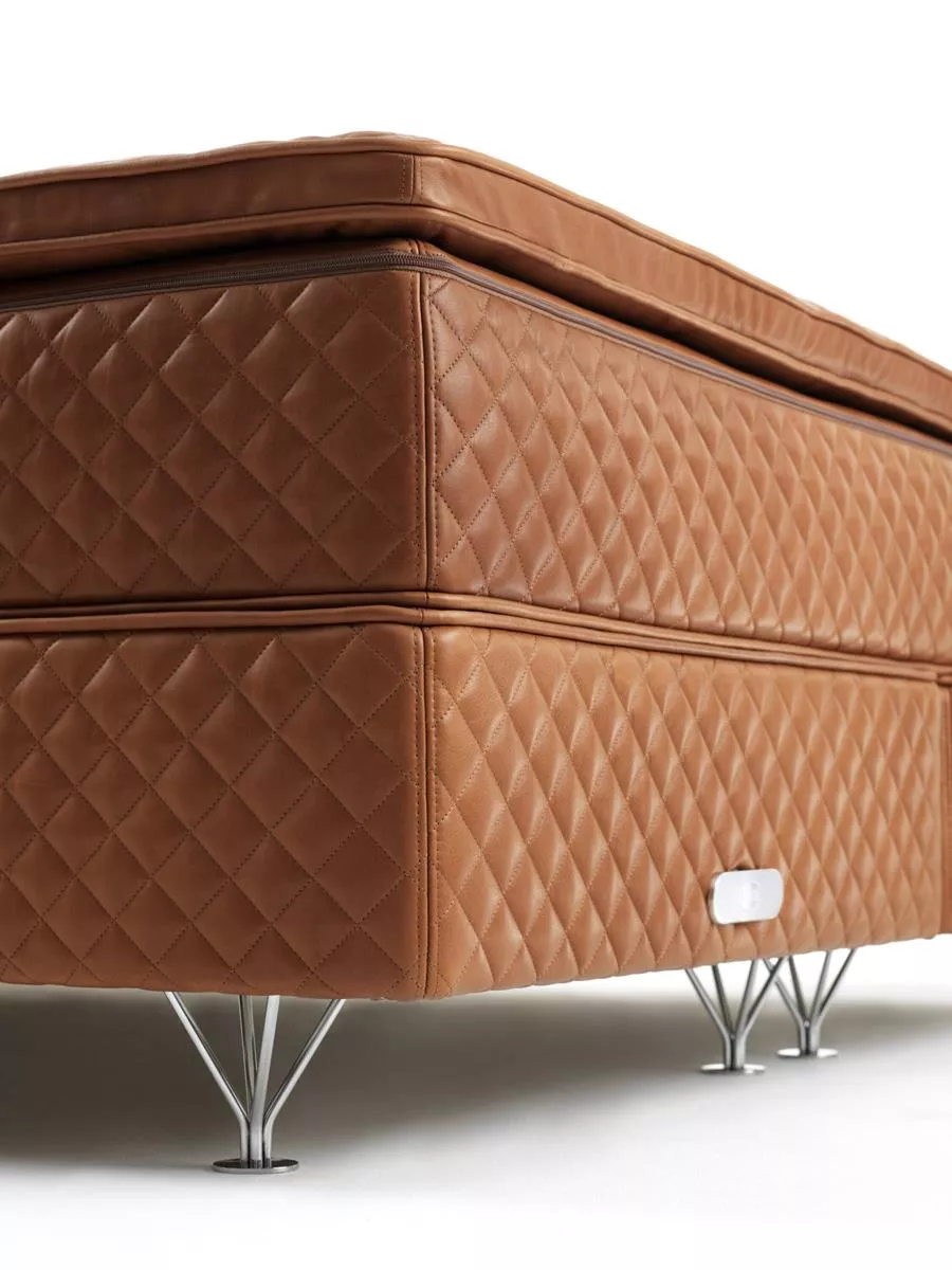 el örgüsü detaylı. Hem Yatak hem de Yatak başlığı özel Dakota derimizle (Cognac veya Black renklerinde mevcuttur) veya Rustic (Elmo Rustic taupe ve Tobacco koyu kahverengi renklerinde mevcuttur) tamamen döşenmiştir.
