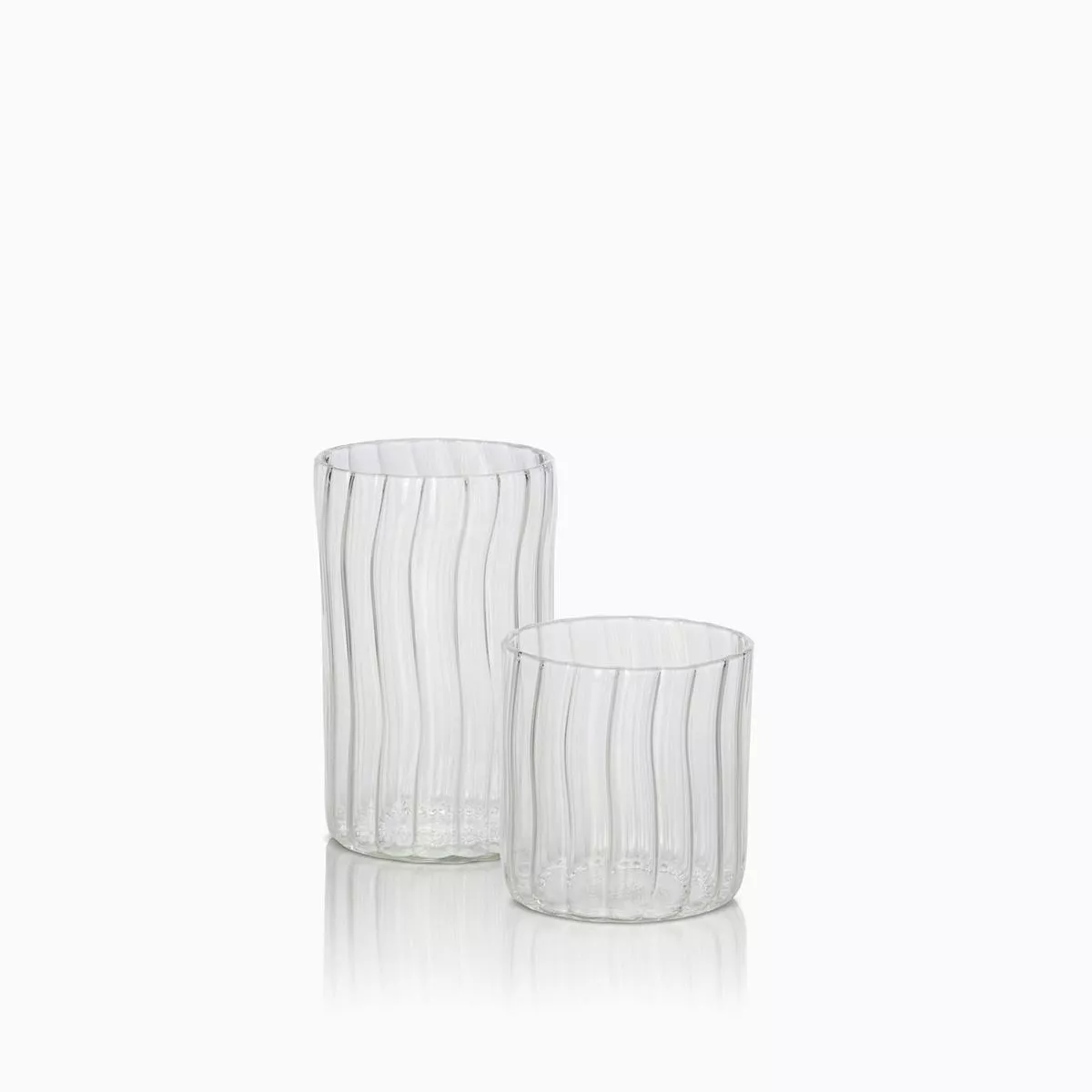 Borosilikattan, kalın yuvarlak kenarlı camlar. Bu gözlükler özellikle hafif ve kullanımı rahattır ve üç şeffaf versiyonu mevcuttur: tamamen şeffaf pürüzsüz yüzey, mavi kenarlı pürüzsüz yüzey ve yönlü yüzey. Alt kısımda Armani/Casa logosu el yazısı.