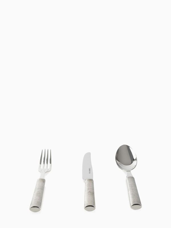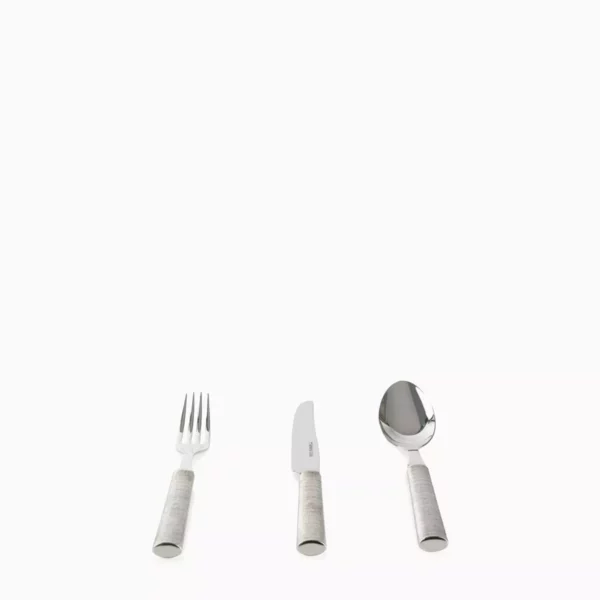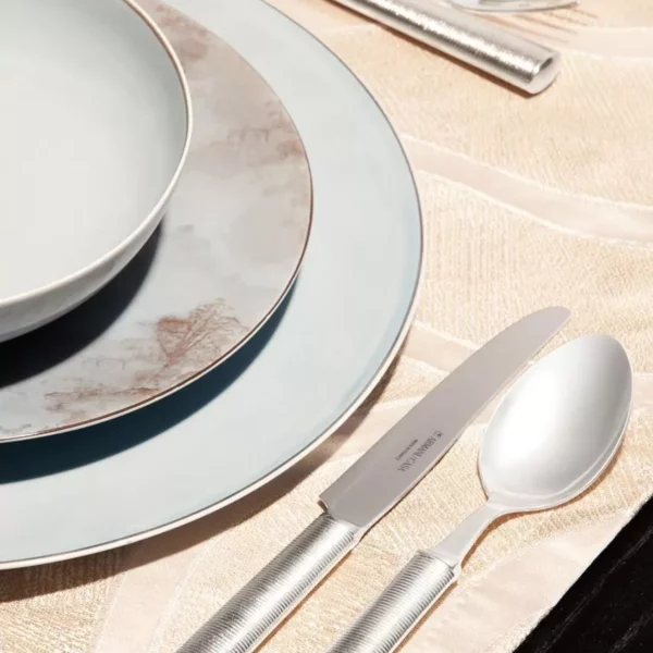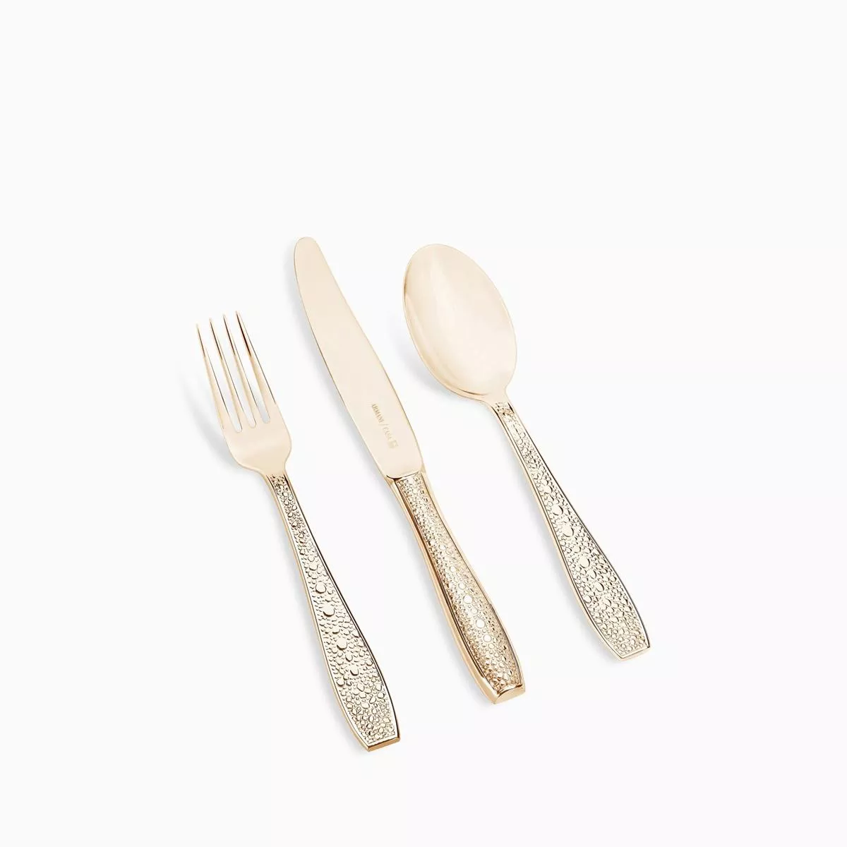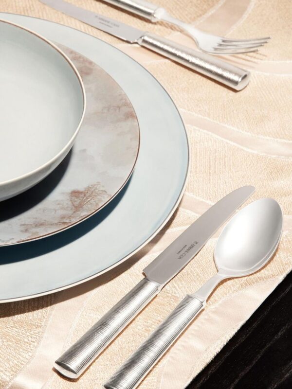 Üç boyutlu shagreen dokuya sahip saplı sofra takımı seti. Gümüş kaplamalı ve modern şampanya PVD kaplamalı olarak mevcuttur. Her parçanın arkasında Armani/Casa logosu yer alırken, bıçaklar bunu bıçak ağzı üzerinde gösterir. Yalnızca nötr deterjanlarla elde yıkayın.