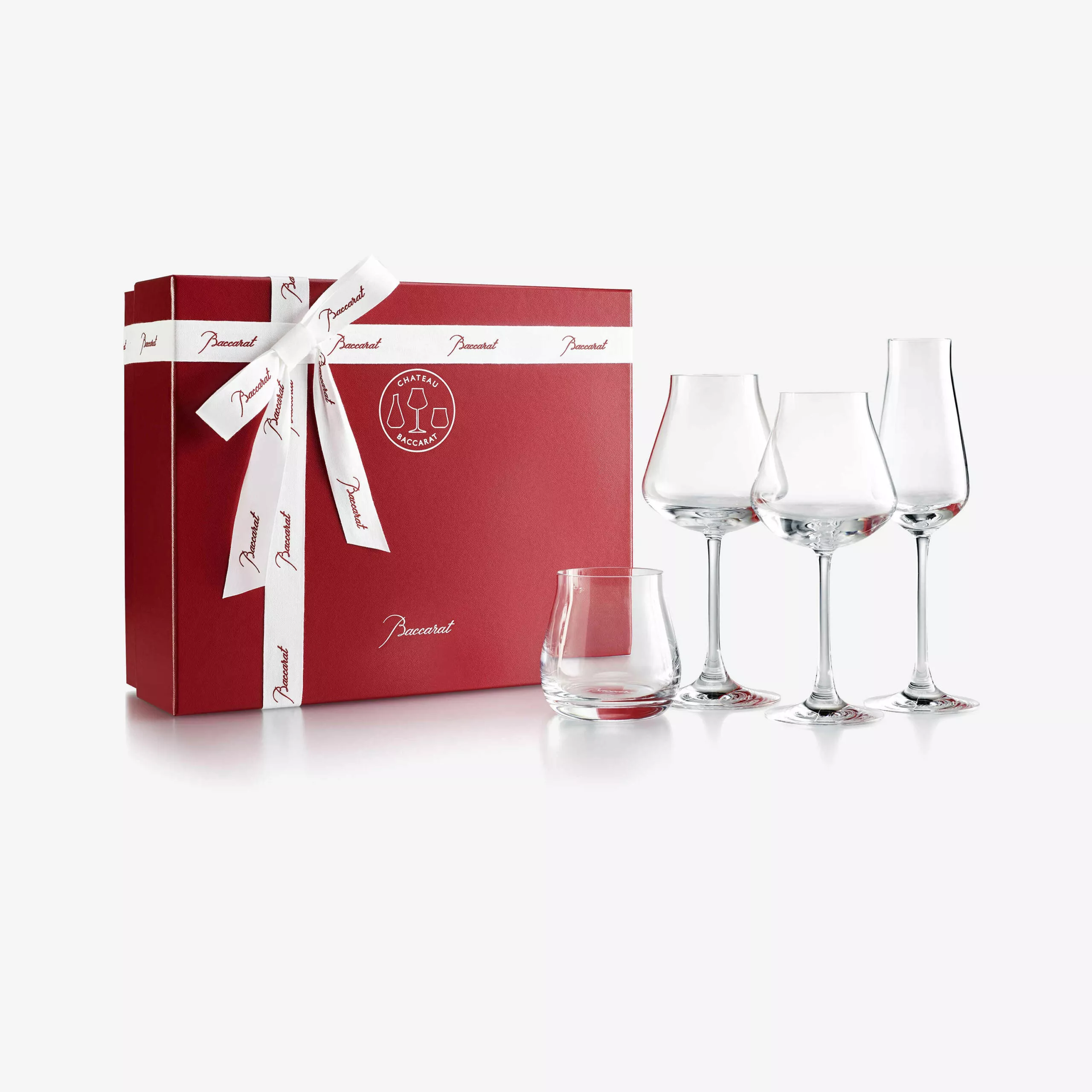 Château Baccarat seti, şarap ve alkollü içkilerin zenginliğini diğerlerinden daha iyi ortaya çıkarmak için şarap tadım sanatında devrim yaratıyor. Baccarat gözlüklerinin ilk koleksiyonuna başlamak için ideal bir hediye. Tanınmış bir şarap uzmanı Bruno Quenioux ile işbirliği içinde geliştirilen Château Baccarat önolojik bardak seti, şarap tadımında devrim yaratıyor. Bardağın yuvarlak ve kavisli bardağı, aromaların uyumunu ve alkol içeriğinin yoğunlaşmasını korur: incelik, günü güce karşı kazanır ve tatma eylemini yüceltir. Sembolik kırmızı tabut içerisinde sunulan 4’lü bardaktan oluşan bu kutu, gerçekten sıra dışı anlara eşlik ediyor. Işıltı katmak için bir şampanya flüt (2611149), her büyük vintage lezzeti zenginleştirmek için iki şarap bardağı (2611150 ve 2611151) ve alkollü içkilerin özünü açığa çıkarmak için bir bardak (2809869).