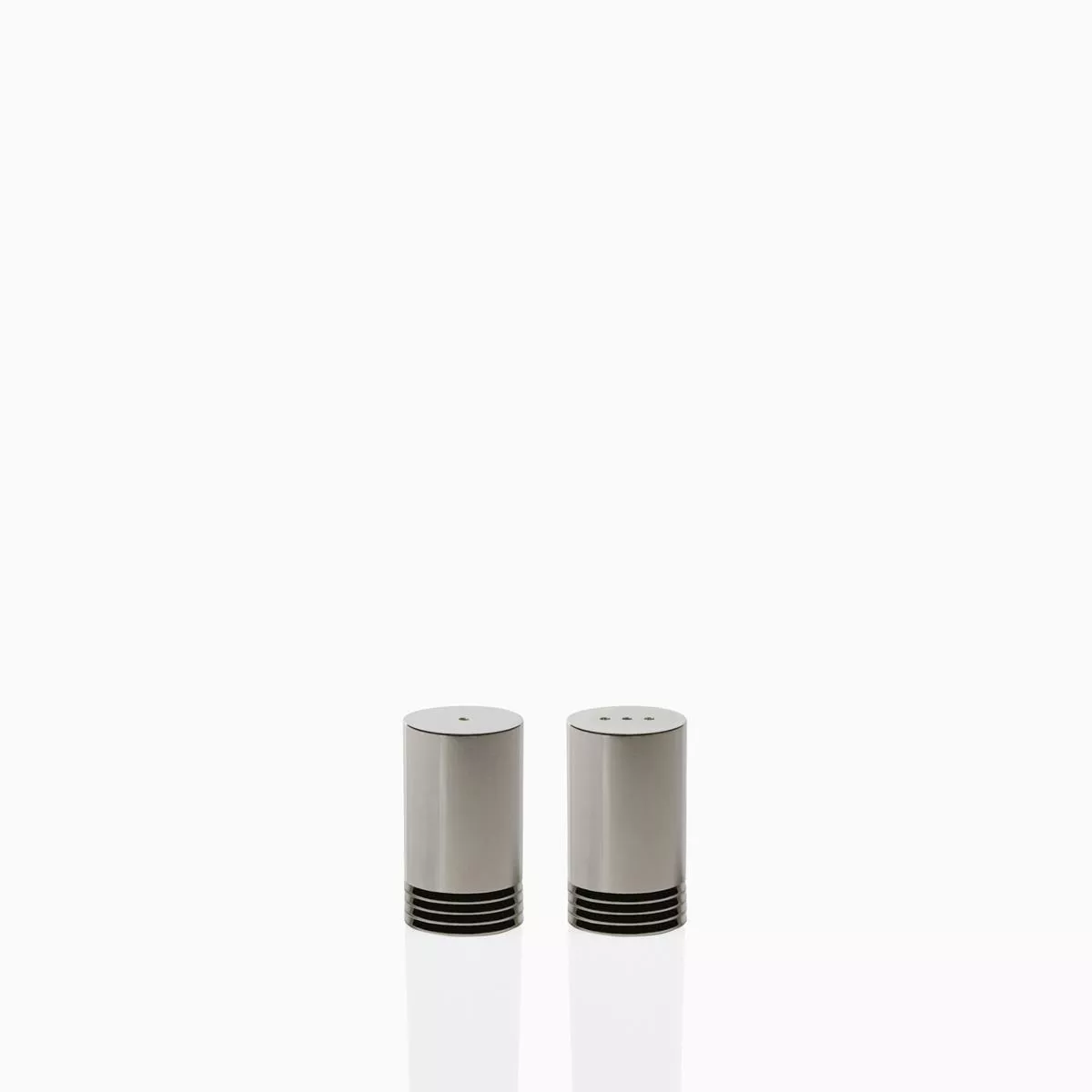 Yağ ve sirke seti. Her kap, tabanında canneté dekorasyonu bulunan gümüş kaplamalı pirinç bir silindirden oluşur; dahili bir pireks şişesi sıvılar içerir. Tasarım, sıvıların cam şişeye geri akmasını sağlayan damlamayan bir ağız içerir.