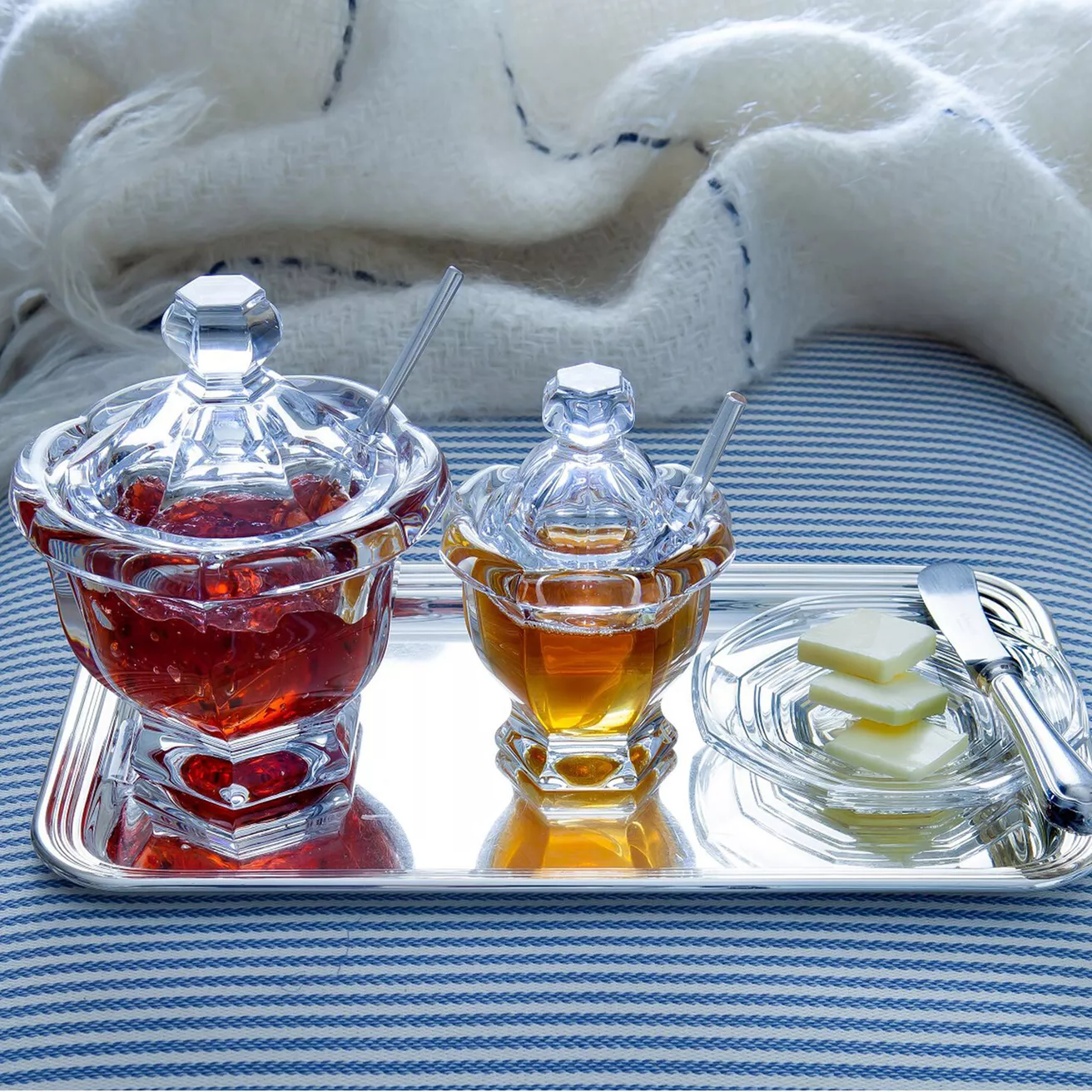 Çarpıcı Harcourt Missouri reçel kavanozu, Baccarat’ın biçiminin titizliğini ve güzel işçiliğini sergiliyor. Bu kavanoz, keyifli bir kahvaltı, hafta sonu brunch’ı veya çay saatinde atıştırmalıklar sırasında kullanmak için mükemmel olan güzel bir üründür. Berrak kristalin berraklığı, içindeki meyveli konservelerin canlılığıyla muhteşem bir kontrast sağlar. Parça, Baccarat Clear kristal servis kaşığıyla birlikte gelir. Harcourt Missouri reçel kavanozu da tek başına dekoratif bir parçadır. Çan şeklindeki kapağın üzerinde yuvarlak bir topuz bulunur ve kasenin kavisli hatları, simetrik formdan 45 derecelik bir açıyla dışarı doğru uzanan kristal kaşığın köşeliliği karşısında öne çıkar. Baccarat Berrak kristal Harcourt Missouri hardal kavanozu da mevcuttur.