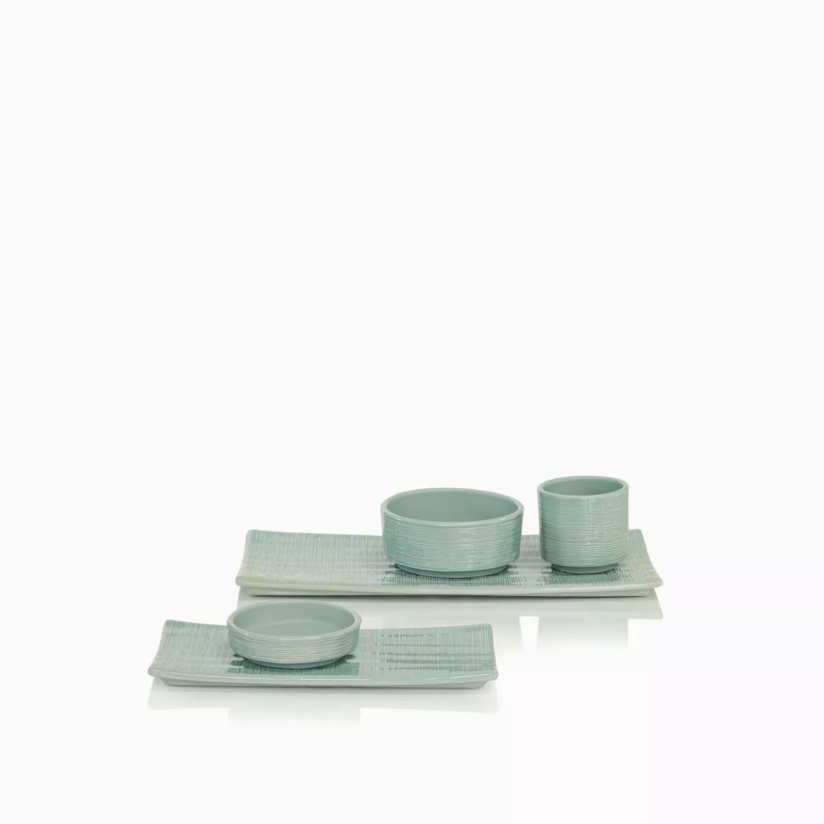 Tatamiden ilham alan üç boyutlu bir dokuya sahip, beş parçadan oluşan suşi seti. Tüm kenarlar hafifçe yuvarlatılmıştır. Altta Armani/Casa logosu. Okura, Naike yemek çubuklarıyla eşleştirilebilir. Bulaşık makinesinde yıkanabilir.