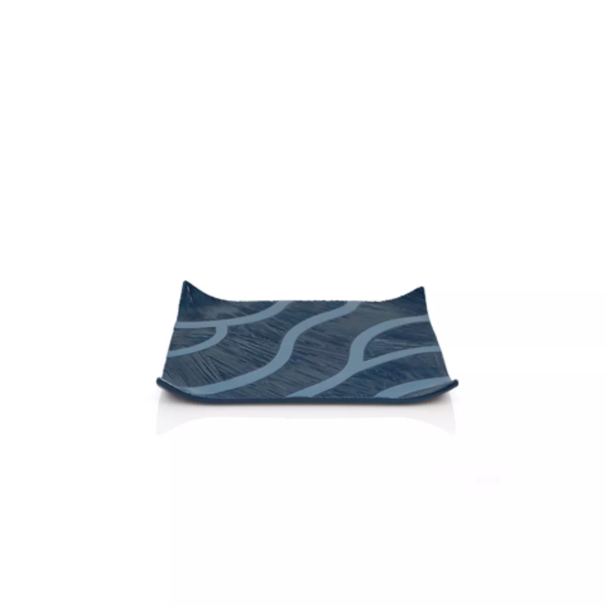 Suva çelik mavisi deseninden ilham alan dokulu sırlı seramikten yapılmış, köşeleri hafifçe yükseltilmiş kare plaka.