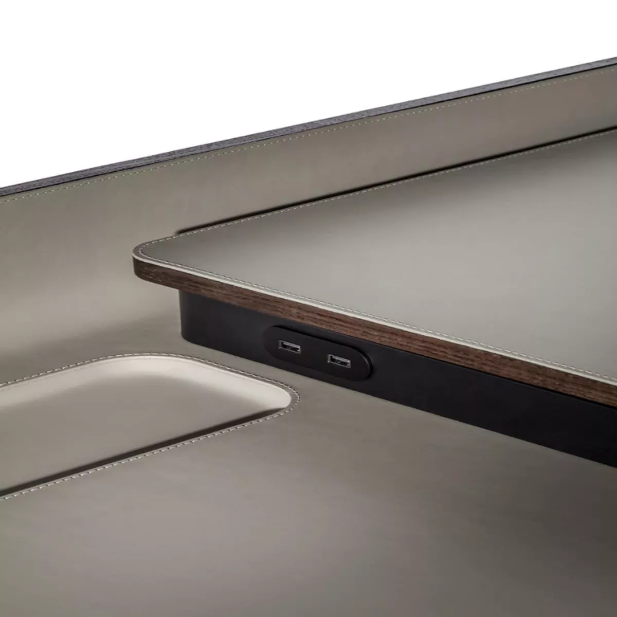 İren masasının çalışma yüzeyi, kayar tabla tamamen açıldığında 119 cm’den 149 cm’ye çıkmaktadır. Görünen ahşap kısımlar Moka veya Wenge lekesinde kül rengindedir. Masaüstü bilgisayarlar, aynı tonda veya kenarlarda kontrast dikişlerle deri veya deri döşemeyle kaplanabilir. Poltrona Frau logosu, kayar yüzeyin sağ alt kısmında markalanmıştır.