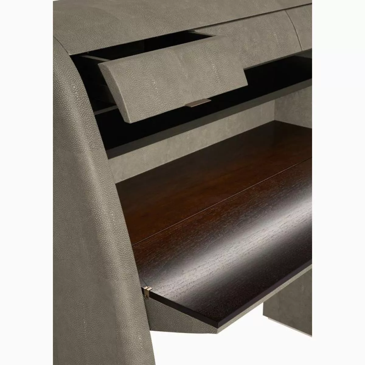 Güçlü bir Art Déco ilhamıyla damgalanan Stendhal sekreter masası, Jade Shagreen Dokulu Deri ile kaplanmıştır: doku, bir baskı işlemi ve ardından rölyefteki rengin açılmasını sağlayan elle fırçalama yoluyla yeniden üretilir. Canaletto Ceviz renginde iç yapı, Saten Açık Pirinçten kulplar, ayaklar ve kablo deliği. Önemli bir teknik özellik, katlanır üst kısmın açılma sistemidir: Açıkta kalan çelik telli özel bir kavrama cihazı aracılığıyla, üst kısım düşmeden yavaşça açılır ve üzerinde çalışırken dengesini korur. Stendhal, rafın altında bir anahtar düğmesi bulunan bir iç LED aydınlatma sistemine sahiptir.