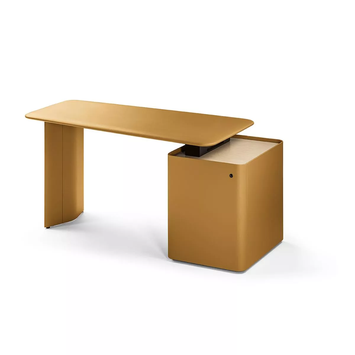 Eyer derisi veya deri çalışma pedli Tekhno Ahşap veya alternatif olarak masaüstü tamamen eyer derisi veya deri ile kaplanabilir.