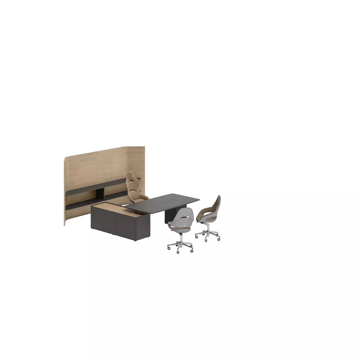 Masaların yatay çizgileri dikey Trust Screen panelleriyle etkileşim halindedir. Düz veya kavisli geometriye sahip ince diyaframlar, boşlukları kapatmadan sınırlandırmanıza olanak tanır. Mesafe koymadan ayırmak ve bir araya getirmek amacında tasarlanmıştır. Raf ve depolama üniteleriyle istenildiği gibi aksesuarlanabilen paneller, montajı kolay ve kendinden destekli sistemi sayesinde modüler olduğundan ofis ortamında özel alanlar yaratabilir.