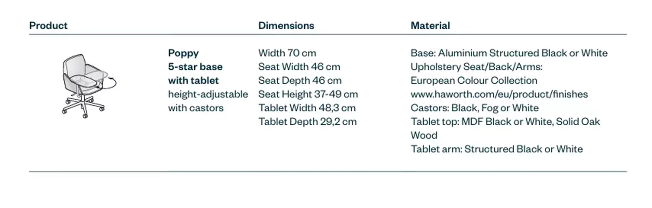 Tabletli Poppy misafir sandalyesi, çeşitli çalışma stillerini ve duruşlarını desteklemek için özel olarak tasarlanmıştır ve bu sayede her türlü çalışma veya öğrenme alanı için mükemmel bir uyum sağlar.