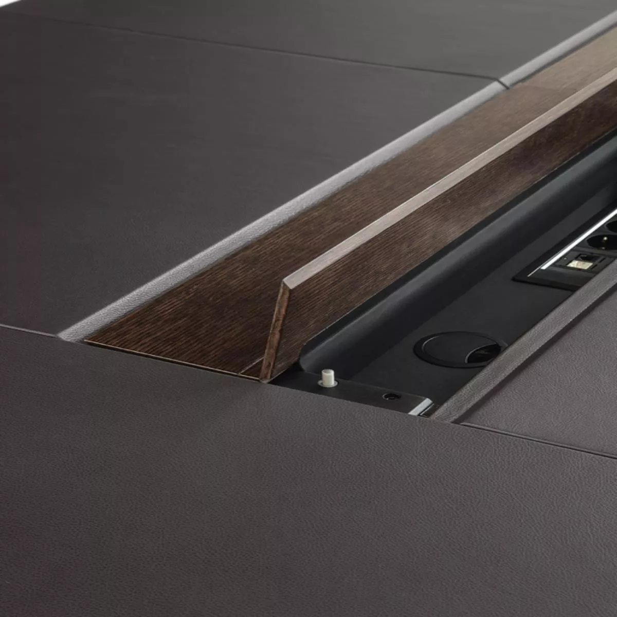 Esnek ve çağdaş bir çalışma alanı talebini karşılamak için İş masaları farklı boyutlarda mevcuttur: Başkan ve Yönetici Masası standart, büyük ve 72 inç versiyonlara sahiptir. Easy Desk’in standart ve büyük versiyonları mevcuttur. Üst kısım, masaya kablo geçitleriyle bağlanan bir depolama ünitesi ile entegre edilmiştir. Jobs Başkan Masası’nda çekmece ünitesi açık bir bölme ve iki çekmeceden oluşur. Jobs Yönetici Masası, iki çekmeceli ve bir dosya çekmeceli asma bir üniteye sahiptir. Dosya çekmecesi gibi yavaş kapanma mekanizmasıyla donatılmış çekmecelerin ön yüzeyleri Pelle Frau® deri ile kaplanmıştır. Her iki mobilya parçasının yapısı, karakteristik T kesitli kurşun renkli fırçalanmış çelikten ve Kurşun veya Tütün meşe kaplamalı ve parlak kaplamalı MDF’den yapılmıştır. Jobs Başkanlık Masasının üst kısmı Pelle Frau® deri ile kaplanmıştır, Kurşun veya Tütün meşesi şerit ile süslenmiştir, mat kaplama uzunluğu boyunca uzanır ve çalışma alanını “misafir alanından” ayırır. ‘Konuk alanı’, yüzeyin geri kalanı gibi Pelle Frau® deriyle veya sütun veya kabinle uyumlu mat, Kurşun veya Tütün meşe kaplamayla kaplanabilir. Üst kısımda ayrıca kablo geçişi olarak da kullanılabilen kalem tutucuyla donatılmış küçük bir iç bölmeye erişen sürgülü bir kapı bulunur. Jobs Yönetici Masası, yan tarafta kilitli bir asma çekmece ünitesine sahiptir. Çekmecenin ön paneli Pelle Frau® deri ile kaplanmıştır ve iç yapısı çizilmez dokulu siyah boyalıdır. Çekmecenin karşı tarafında yani ‘misafir alanı’ tarafında çekmece ünitesinde açık bir bölme bulunur. Jobs Executive ve Jobs Easy Masaları ayrıca, Kurşun veya Tütün meşe kaplamalı ve mat yüzeyli, masanın destekleyici metal çerçevesi üzerine monte edilmiş dairesel bir masa tablası olan ‘Toplantı alanı’ içeren bir versiyon da sunmaktadır.